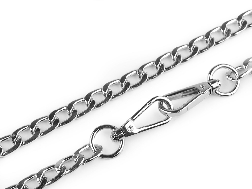 Kovový řetízek s velkými očky se skvěle hodí k psaníčkům, menším kabelkám nebo pouzdrům na mobilní telefony. Na obou jeho koncích najdete připevněné karabinky.- Šířka: 11 mm