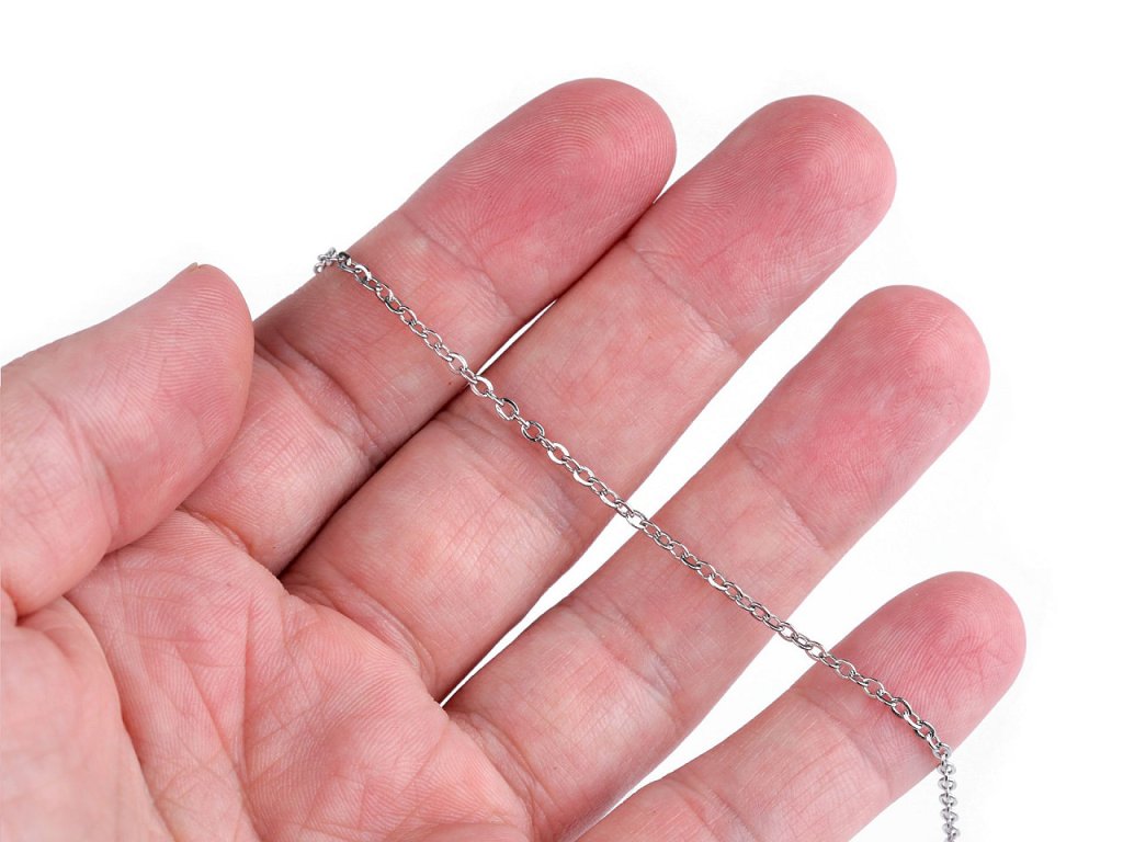 Řetízek z nerezové oceli z plochých oček je základním komponentem pro tvorbu bižuterie. Je pevný, velice kvalitní. Pomocí spojovacího kroužku na něj můžete připojit zapínání. Upozorňujeme zákazníky, že vnitřní průměr očka řetízku je velice malý. Průvlek očka je 0,7 mm, průvlek posledního očka je 0,9 mm. Přívěsek doporučujeme zavěsit na šlupnu, ketlovací jehla očkem řetízku projde velice obtížně.- Šířka: 2 mm