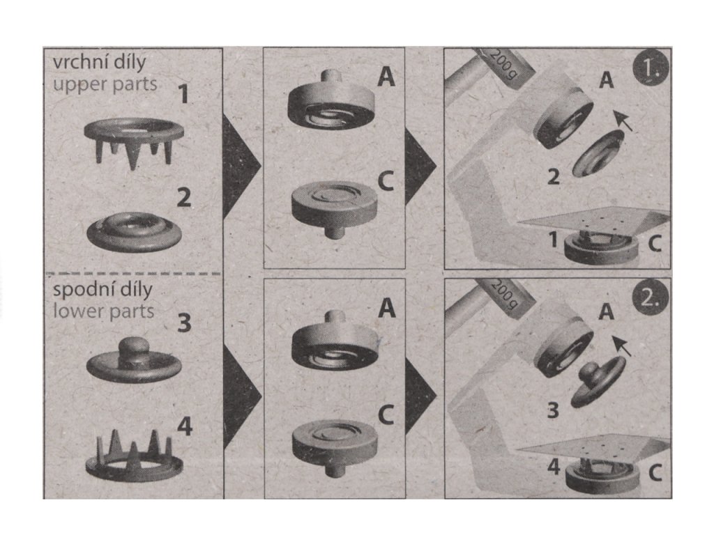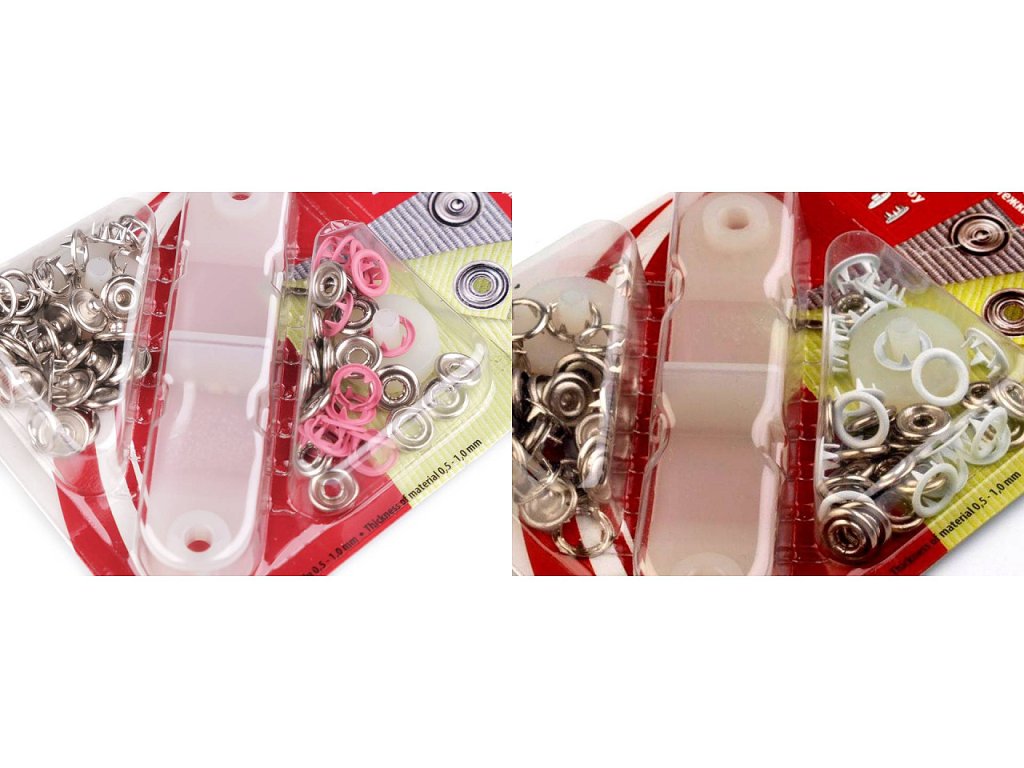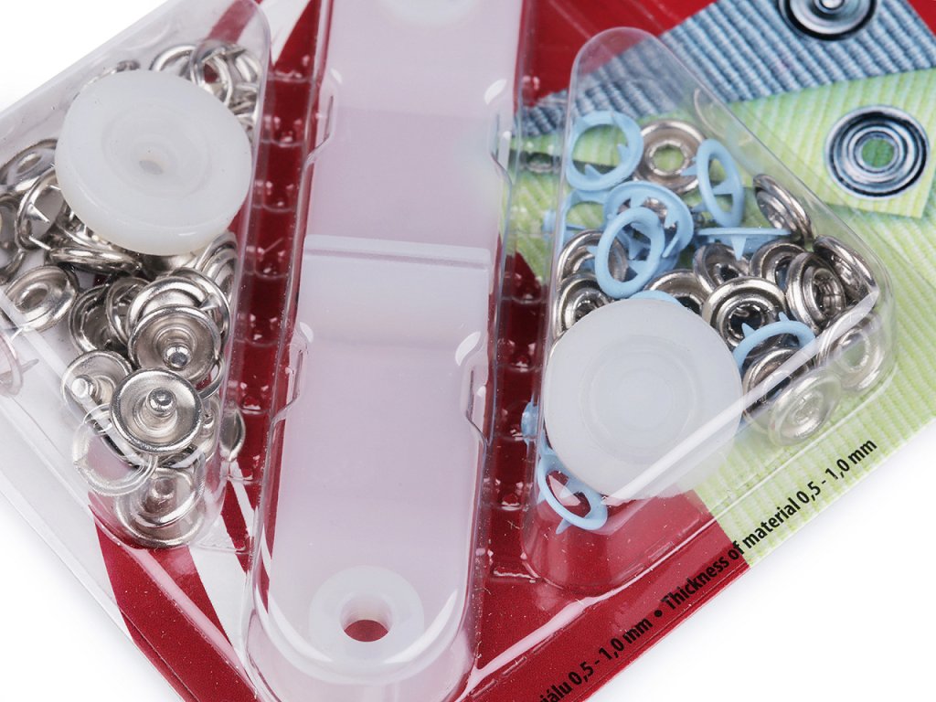Knoflíky se používají ke spojování jemných a poddajných druhů látek - froté, úplet, košilovina aj. Nýtování se provádí mini lisem, který je součást balení. Jsou lakované.- Průměr: 10 mm