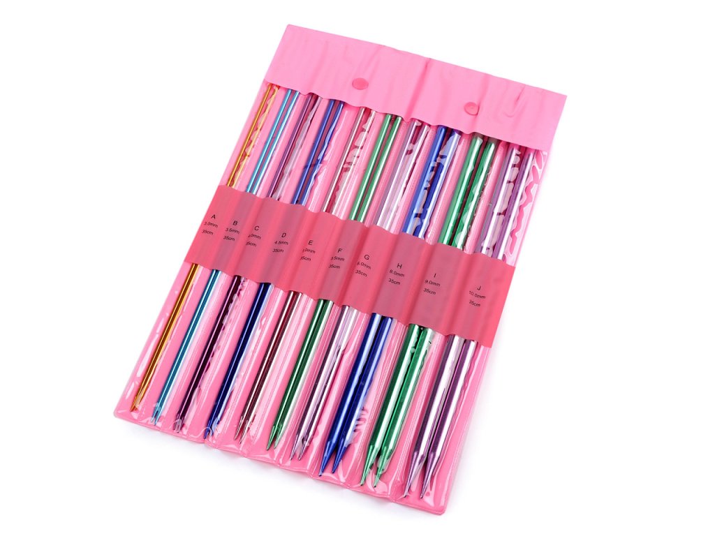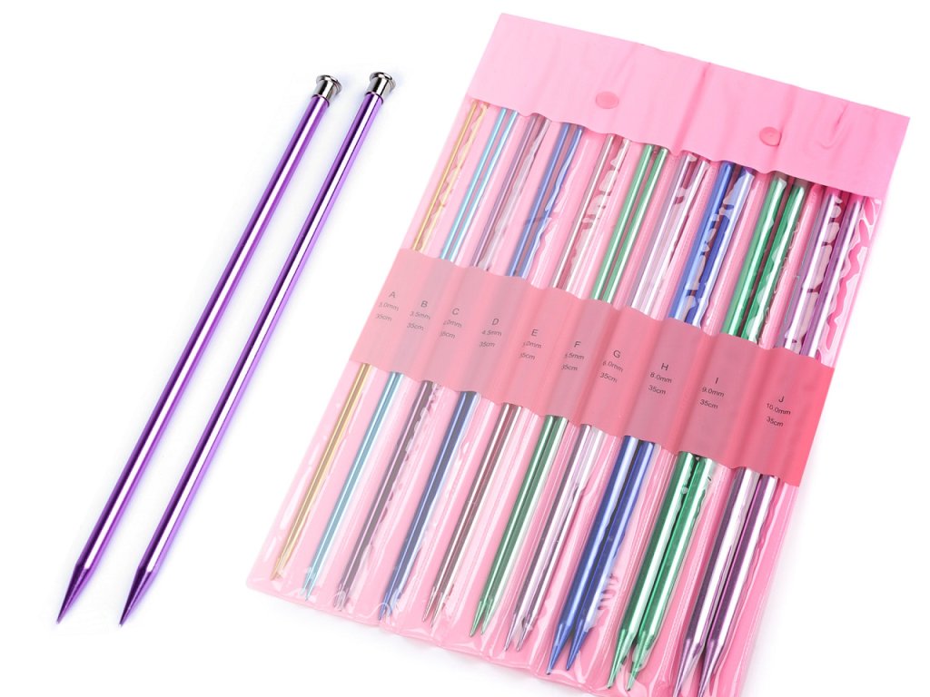 Rovné pletací jehlice jsou lehké. Jejich lehce prodloužená špička umožňuje pohodlné pletení. Dobře se drží v ruce. Velikost průměru je barevně odlišena. Po jejich hladkém povrchu se snadno posouvá příze. Slabé jehlice jsou vhodné na tenké příze, jehlice s vyšším číslem naopak na silnější příze a materiál.- Průměr: 3; 3,5; 4; 4,5; 5; 5,5; 6; 8; 9; 10 mm