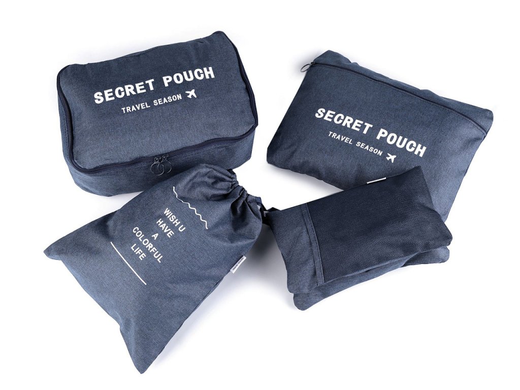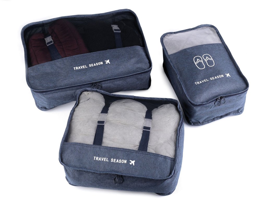 Sada 7 pouzder je vyrobená z pevného materiálu. Je praktická nejen na cestách. Pouzdra mají spoustu zajímavých funkcí. Pomohou systematicky roztřídit spodní prádlo, oblečení a další věci. Díky nim pohodlně a přehledně uložíte věci do kufru, batohu i skříně. Ocení je i studenti na internátech a kolejích. Je složená ze 4 prostorných textilních pouzder s uchem k přenášení se zapínáním na zip, jedno z nich je určené na boty, a dále ze 2 plochých pouzder, která se také zapínají na zip a 1 stahovacího pytlíku. Rozměry prostorných pouzder jsou: 30 x 40 x 12 cm, 28 x 33 x 12 cm (obě pouzdra mají popruhy na upnutí vložených věcí), 20 x 30 x 11 cm a pouzdro určené na boty má rozměry 20 x 33 x 12 cm. Rozměry plochých pouzder jsou: 27 x 33 cm a 25 x 33 cm, toto pouzdro se dá pomocí patentů sepnout a rozdělit na dvě poloviny. Rozměry stahovacího pytlíku jsou 25 x 34 cm.- Rozměry: 25 x 33 - 34 x 40 x 12 cm