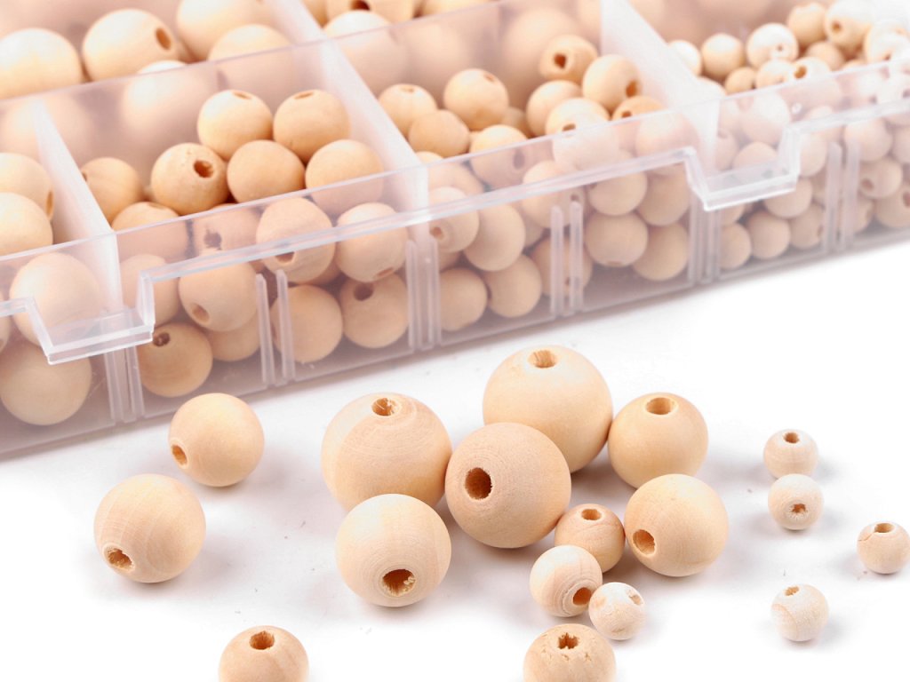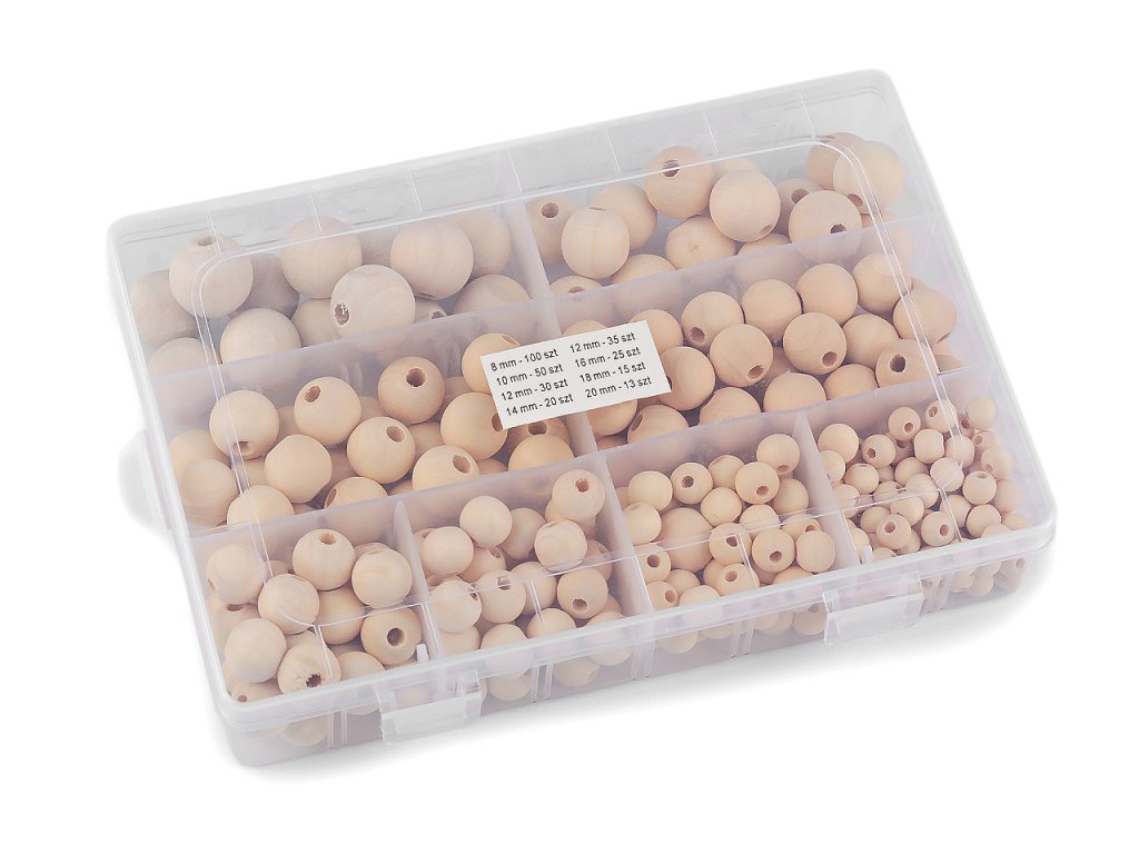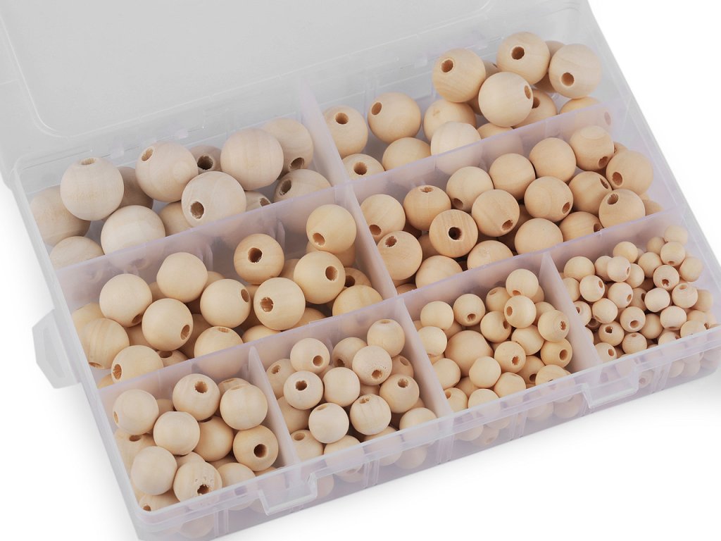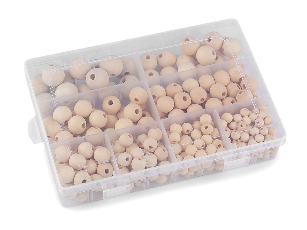 Sada dřevěných korálků v praktickém boxu potěší malé i velké korálkářky. Dřevěné korálky mají velké možnosti použití. Jsou velice oblíbené na macrame i v kombinaci s pedigem, své využití najdou i při výrobě lapačů snů. Jejich přírodní nelakovaný povrch můžete upravit např. barevným mořením, které krásně zvýrazní samotné dřevo a jeho letokruhy. Můžete využít i různé typy laků a olejů. Ale není to nutné, korálky jsou zajímavé i v jejich přirozené přírodní podobě. Hodí se i na výrobu náhrdelníků a náramků. Jejich velikou výhodou je lehká hmotnost. Box je rozdělený na 8 přihrádek. Obsahuje korálky o Ø8, 10, 12, 14, 16, 18 a 20 mm. Dohromady obsahuje cca 288 ks korálků. Uvnitř najdete korálky: - Ø8 mm - 100 ks, - Ø10 mm - 50 ks, - Ø12 mm - 30 ks, - Ø12 mm - 35 ks, - Ø14 mm - 20 ks, - Ø16 mm - 25 ks, - Ø18 mm - 15 ks, - Ø20 mm - 13 ks.- Průměr: 8 - 20 mm