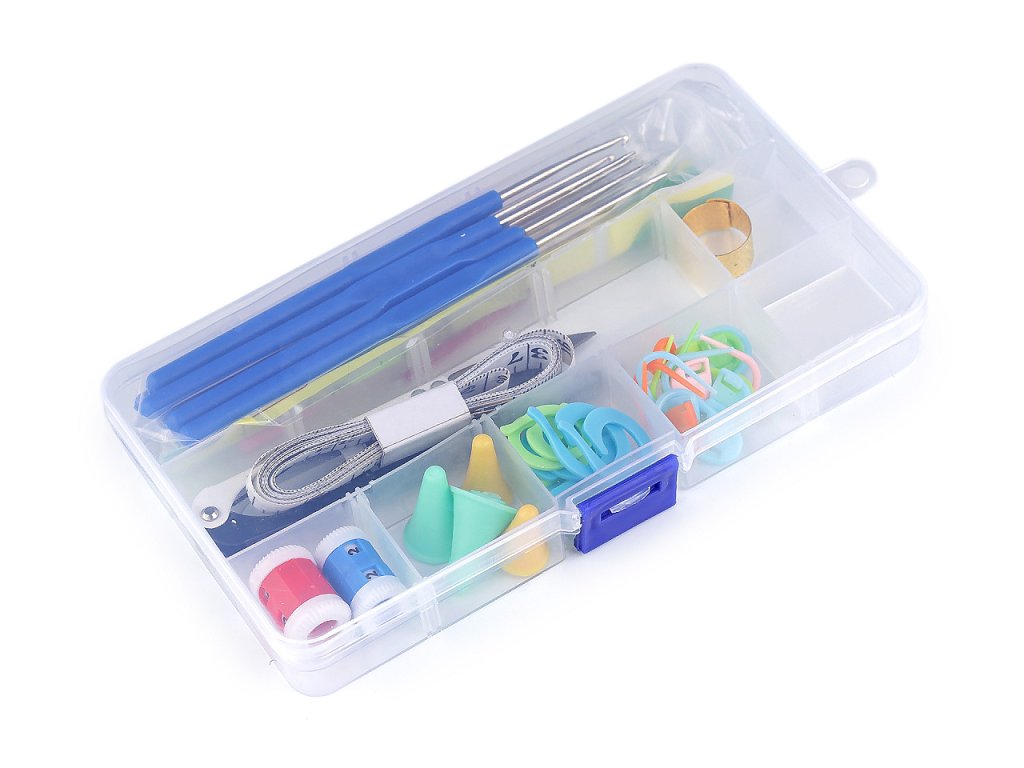 Sada háčků a pomůcek na háčkování je přehledně uložena v plastovém boxu. Sada obsahuje 8 kovových háčků s plastovou rukojetí následujících velikostí: 0,6; 0,75; 0,9; 1,1; 1,2; 1,5; 1,6; 1,75 mm. Dále pak nůžky cvakačky, oboustranný krejčovský metr (150 cm/60 inches), počítadlo řad, plastové pomocné jehlice, plastové jehly, kovový náprstek, koncovky na háčky a sadu plastových kroužků a spínacích špendlíků na označování řad. Přihrádky v boxu lze upravovat podle potřeby.- Rozměry boxu: 10 x 17,3 x 2,2 cm