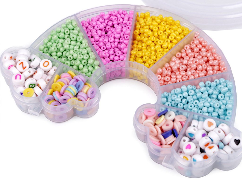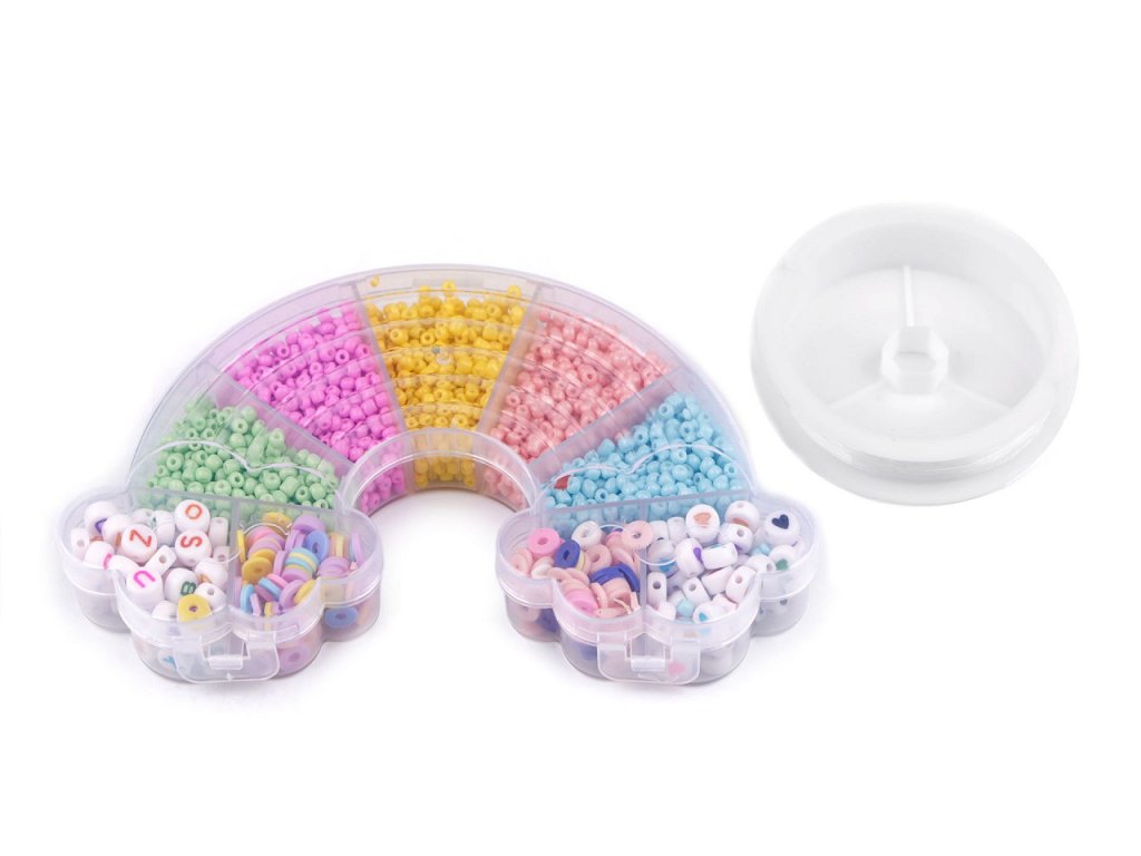 Sada rokajlů, silikonových placiček a plastových korálků v průhledném boxu ve tvaru duhy s mráčky potěší malé i velké korálkářky. Jsou skvělé na výrobu náramků a náhrdelníků, protože k sadě je přibalená i silikonová gumička na navlékání. Box je rozdělený na 9 přihrádek. 5 přihrádek obsahuje rokajl, 2 přihrádky obsahují silikonové placičky různých barev, 1 přihrádka obsahuje plastové korálky s písmenky, 1 přihrádka obsahuje plastové korálky se srdíčky, gumička má průměr 0,45 mm.- Rozměry boxu: 10 x 15 x 2 cm
