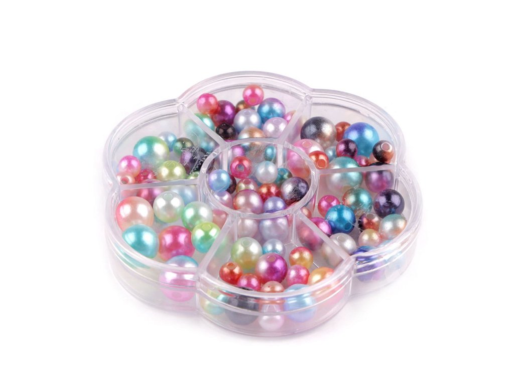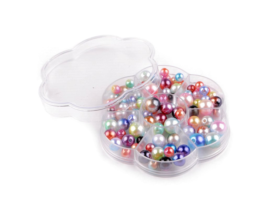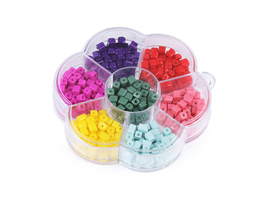 Plastový box ve tvaru květu obsahuje barevný mix plastových korálků. Víčko je sundavací, box má očko k zavěšení. Náš tip: sada bude bezvadným dárkem pro dívky, které využijí korálky na náramky nebo náhrdelníky. Box č. 1 obsahuje hranaté korálky s jemně perleťovým povrchem. Mají tvar kostiček o stranách 3 x 3 mm a nepravidelné délce 2 - 8 mm. Box č. 2 obsahuje kulaté korálky s duhovým perlovým povrchem. Mají průměr 5 - 10 mm. Hmotnost korálků celkem je cca 25 g, v každé přihrádce je cca 3,5 g korálků.- Průměr: 5 - 10 mm