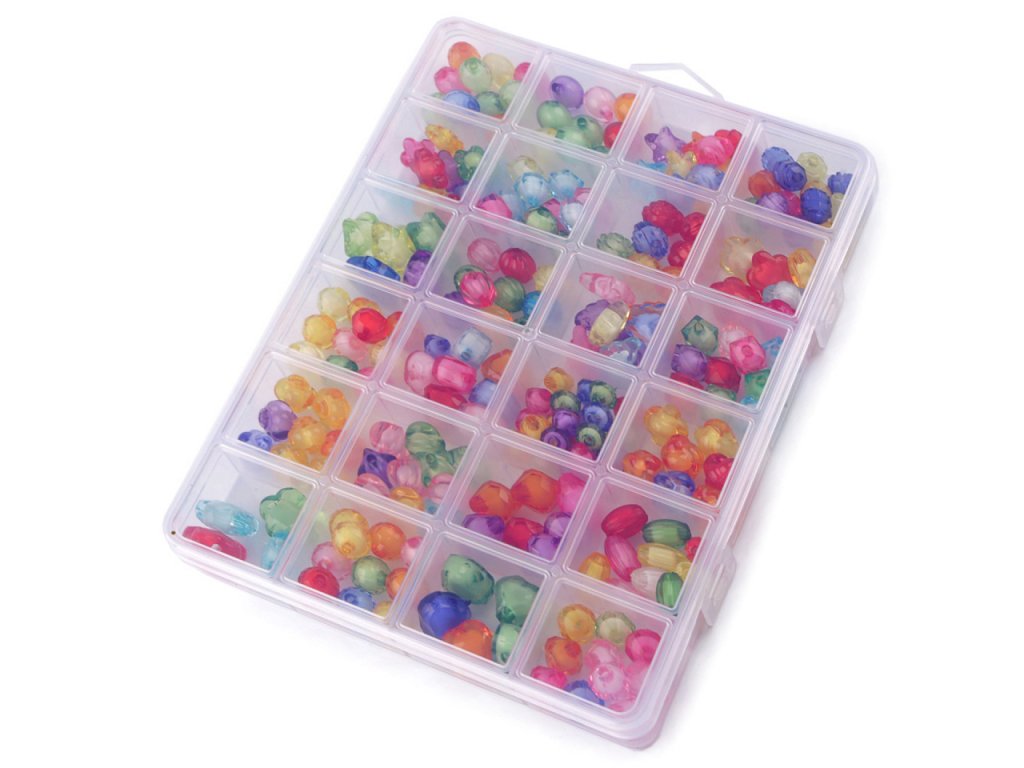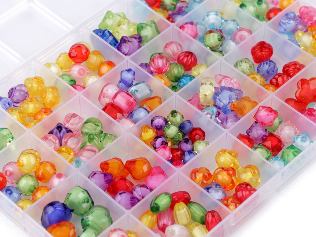 Sada plastových korálků v boxu potěší malé i velké korálkářky. Jsou jedinečné nejen svými různými tvary, ale především jsou zajímavé svou transparentnosti a ploškám, které tvoří velice poutavé světelné odlesky. Můžete je použít k různým korálkovým technikám, např. na výrobu náhrdelníků a náramků, úchvatné budou v korálkových závěsech. Jejich velikou výhodou je lehká hmotnost. Box je rozdělený na 24 přihrádek. Dohromady obsahuje cca 220 ks korálků. Namátkově uvádíme tyto tvary - kulaté, olivy, motýlci, květy, hvězdy, srdce a další.- Průměr: cca 8 - 15 mm