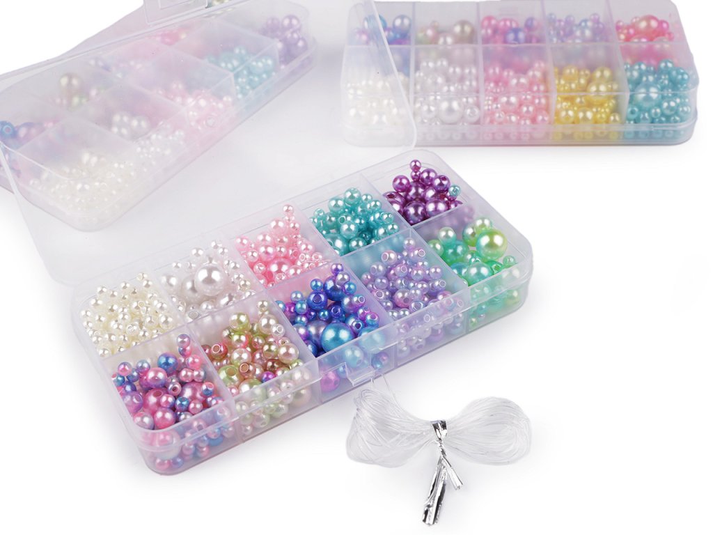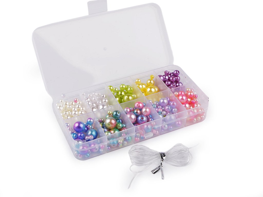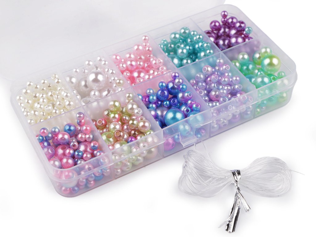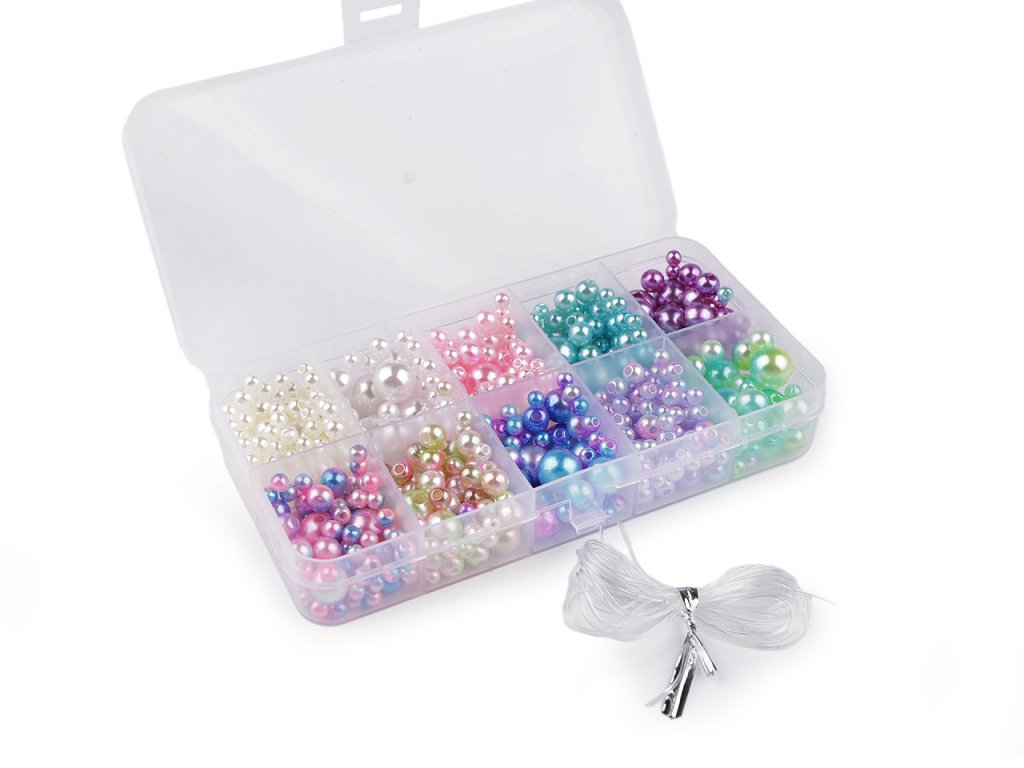 Plastový box obsahuje mix plastových perel a silikonovou pruženku na navlékání. Najdete v něm korálky různých barev a velikostí. Náš tip: sada bude bezvadným dárkem pro dívky, které využijí korálky na náramky nebo náhrdelníky. Box obsahuje korálky s průměrem od 4 do 10 mm s průvlekem 1,2 - 2 mm a pruženku dlouhou 1,8 m.- Průměr: 4 - 10 mm