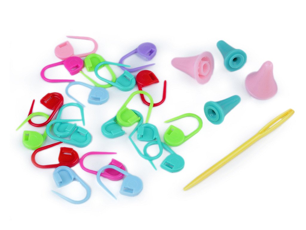 Sada pomůcek na pletení či háčkování je výborným pomocníkem pro začátečníky i pokročilé. Obsah sady: - koncovky na jehlice (4 ks) - plastový spínací špendlík na pletení (20 ks) - plastová tupá jehla (1 ks)- Sada: 25 ks