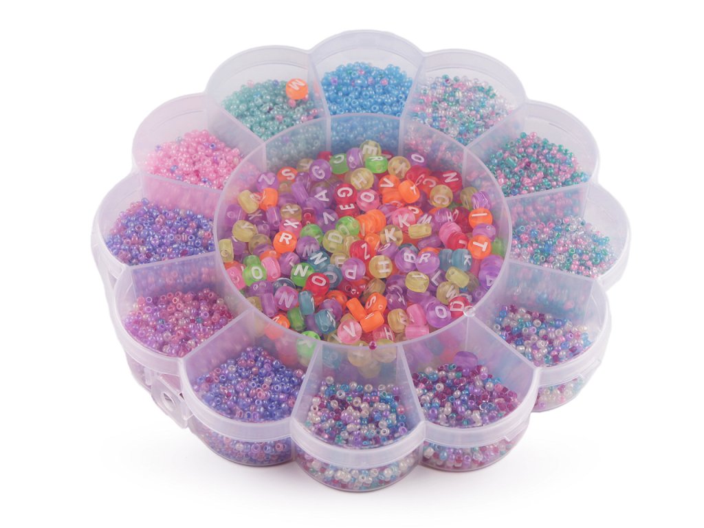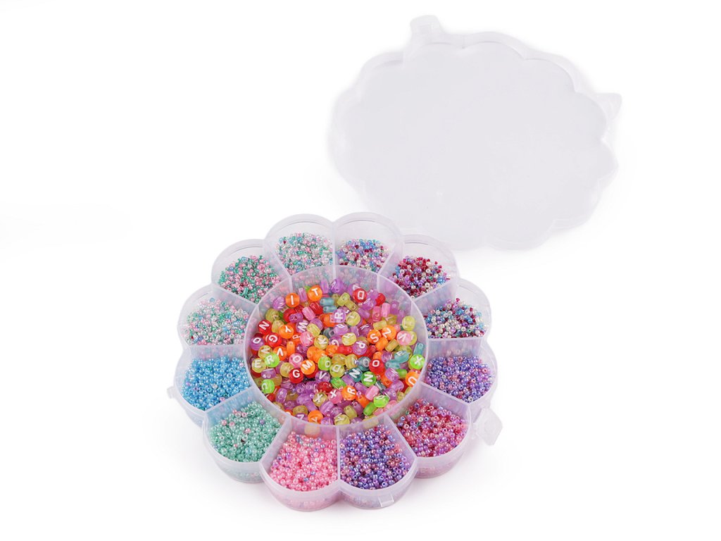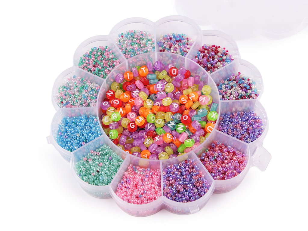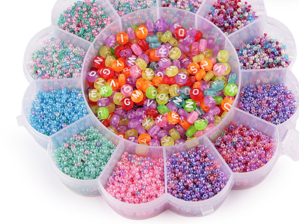 Sada rokajlů a plastových korálků s písmenky v průhledném boxu ve tvaru květu potěší malé i velké korálkářky. Jsou skvělé na výrobu náramků a náhrdelníků. Box je rozdělený na 13 přihrádek. 12 přihrádek obsahuje rokajl, 1 velká přihrádka ve středu obsahuje barevné transparentní korálky s písmenky. Upozorňujeme zákazníky, že korálky jsou navzájem promíchané - sesypané.- Rozměry boxu: 15,5 x 15,5 x 2,5 cm