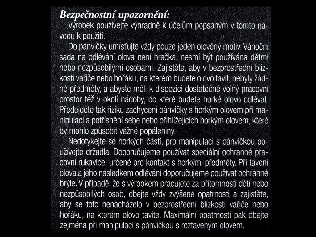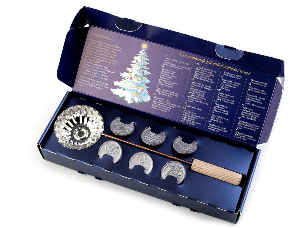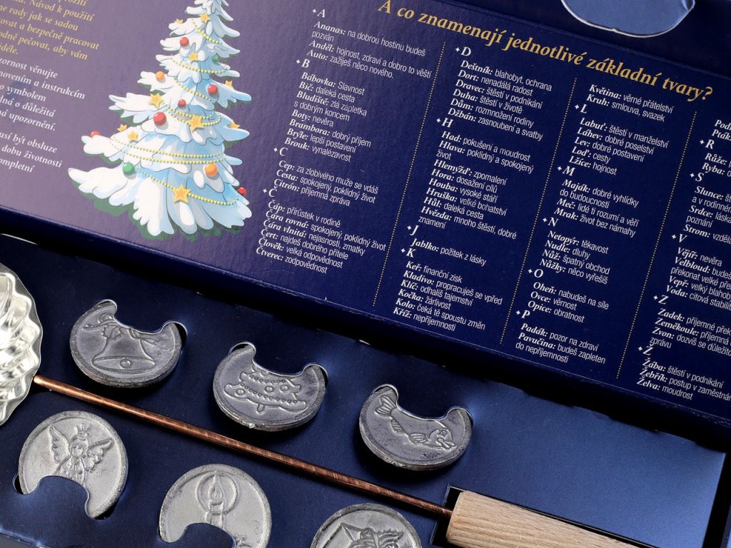 Vánoční souprava lití olova obsahuje vše, co budete k tradičnímu lití olova potřebovat - pánvičku na tavení a 6 olověných mincí ozdobených vánočními reliéfy. To vše zabalené v krásné dárkové krabici. Podle tvaru vylitého olůvka se usuzuje, co koho v následujícím roce čeká. Výkladový slovník naleznete uvnitř balení. Sadu můžete opakovaně používat, olovo se dá opět roztavit a použít i následující rok. Návod k použití včetně bezpečnostních pokynů je uveden na obalu. Váha mincí se pohybuje mezi 11,85 g až 13,40 g. Záleží na vyraženém motivu na minci, každá mince má jiný motiv). Videonávod jak na to.- Rozměry balení: 7,5 x 21,5 x 3,5 cm