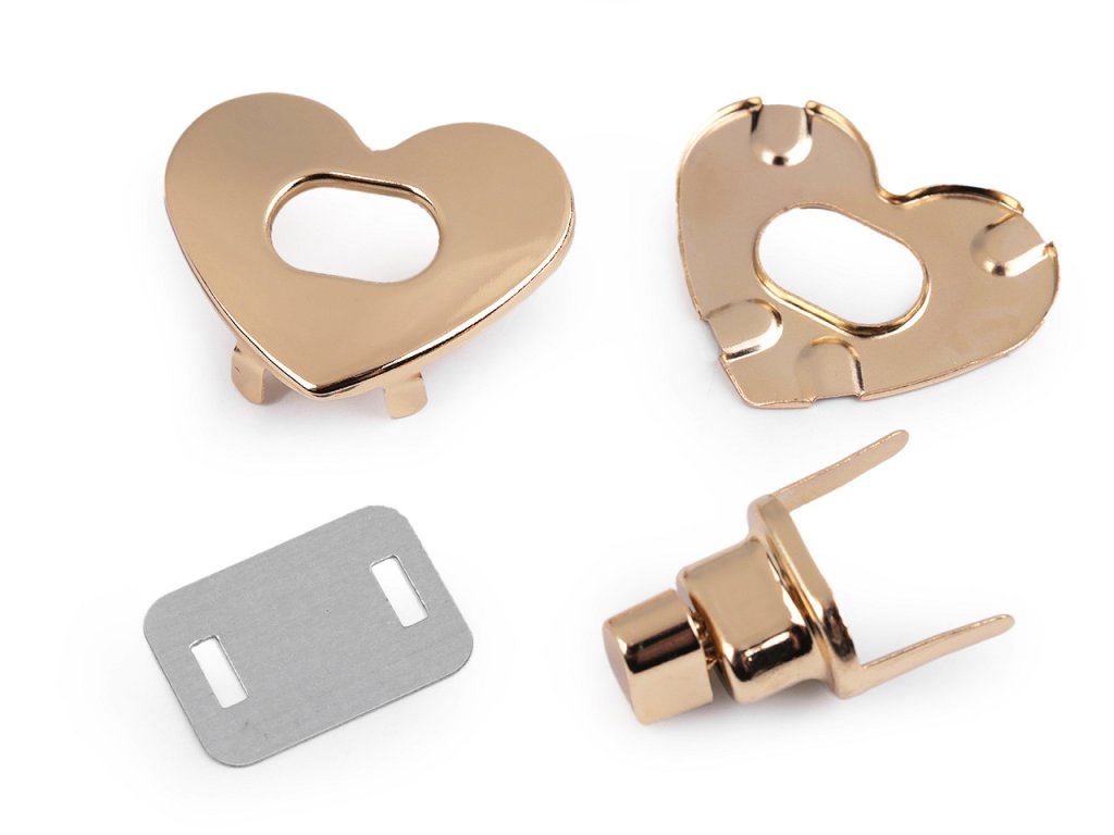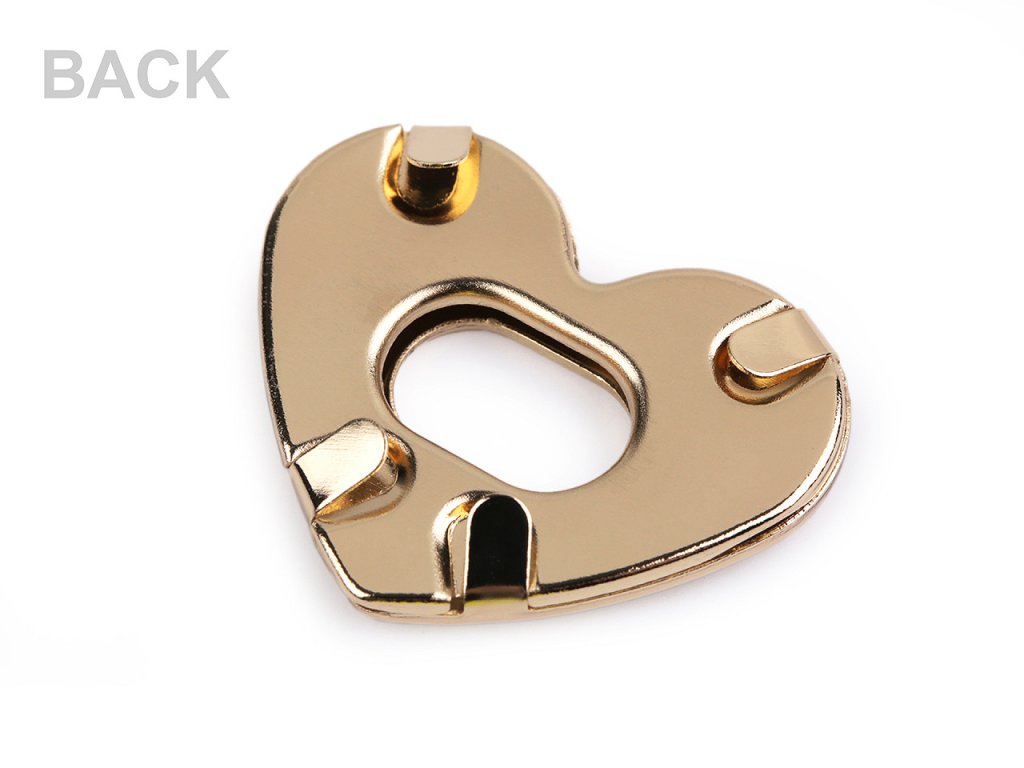 Zapínání ve tvaru srdce na kabelku či tašku se skládá ze čtyř dílů. Plíšek se připevní na vnitřní část tašky, díl s nožkami na vnější část (nožky se zaháknou do plíšku a roztáhnou). Stejným způsobem se připevní i díly se srdcem - část s nožičkami se připevní na vrchní část chlopně. Rozměry: - plíšek: 16 x 22 mm - díl s nožkami: 12 x 16 mm - díl se srdcem: 26 x 32 mm.- Rozměry: 26 x 32 mm