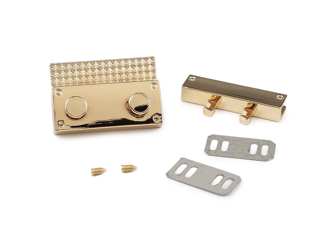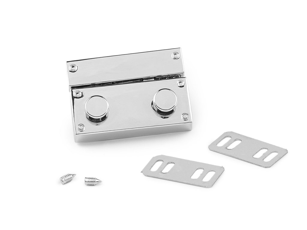 Designové kovové zapínání elegantně a prakticky ozdobí tašky, kabelky a batohy s klopou. Otevírá se posunutím knoflíku. Horní díl se připevňuje pomocí přiložených šroubků. Spodní díl se upevňuje nožičkami, které se z rubové strany zajistí plíšky. Sada obsahuje kovové zapínání, které se skládá ze 2 kusů, 2 šroubky a 2 plíšky.- Rozměry: 27 x 41 mm