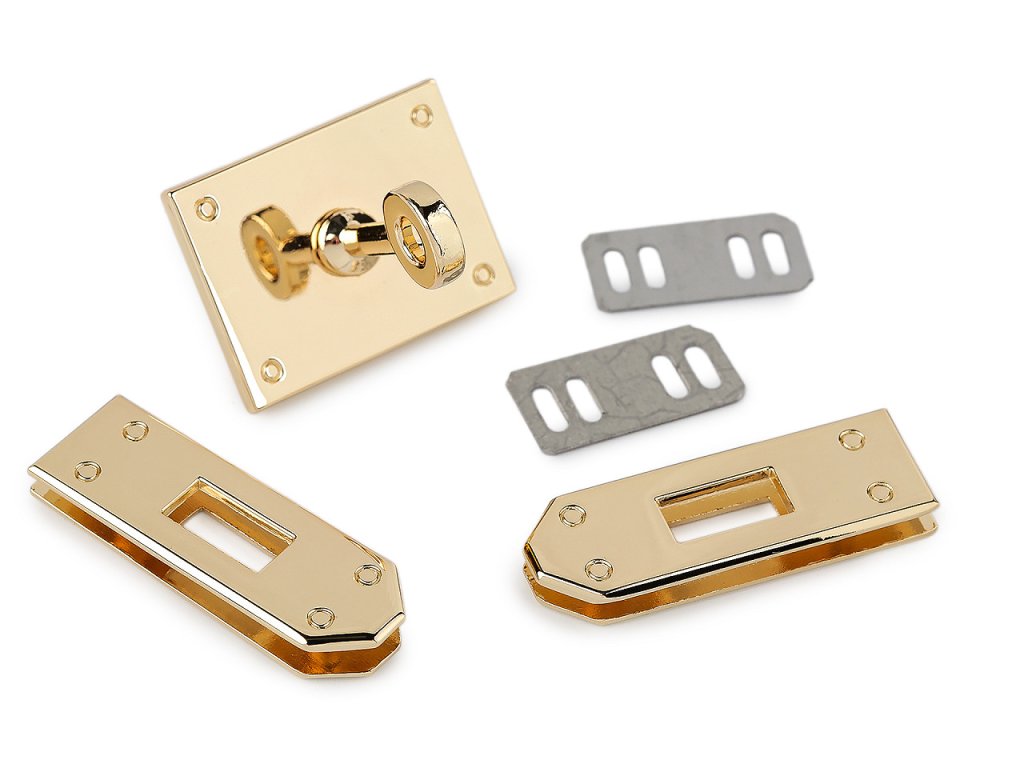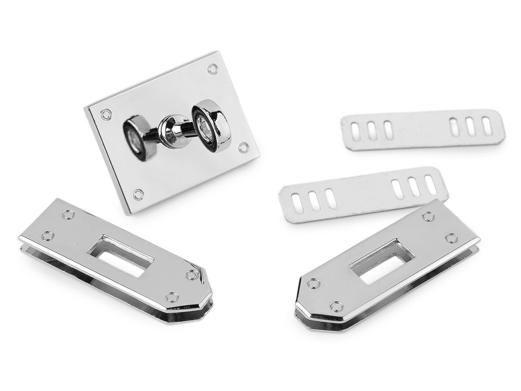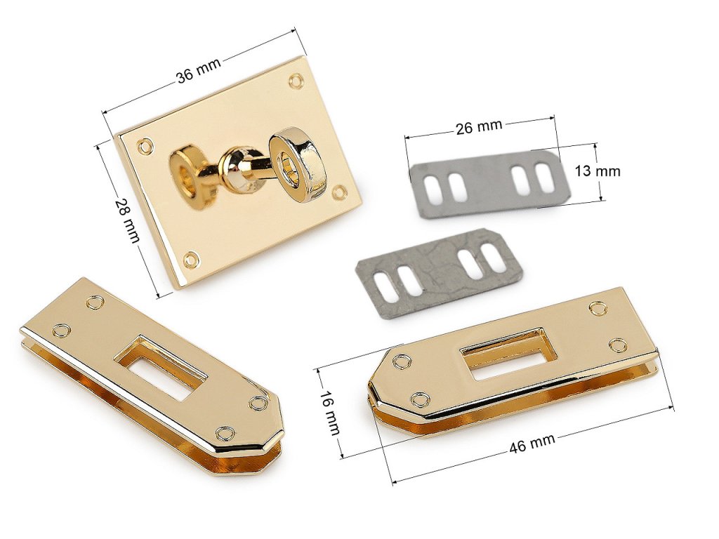 Speciální otočné zapínání dodá každé kabelce a tašce nádech luxusu a elegance. Podobného stylu zapínání si můžete všimnout u světoznámých značek. Vyniká originalitou a vysokou kvalitou. Skládá se ze tří hlavních dílů. Díl s tyčinkou a otočným očkem se připevňuje pomocí dvou plíšků, kterými ho k materiálu zajistíte. Další díly se připevňují pomocí přiložených šroubků na postranní řemínky kabelky. Řemínky jsou vhodné s šíří 15 mm.- Rozměry: 28 x 46 mm