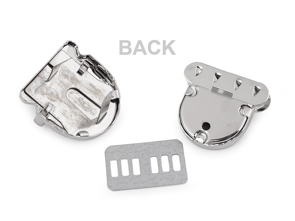 Zapínání na kabelku či tašku se skládá ze tří dílů. Díl s nožičkami se připevní na vnější část kabelky, plíšek z druhé strany na vnitřní část a třetí díl pomocí zoubků na její chlopeň. Pak už jen stačí zasunout do sebe tak, až uslyšíte cvaknutí. Potom je teprve kabelka bezpečně uzavřena. Zapínání je vyrobené z magnetizujícího kovu. Nožičky na zadní straně jsou dlouhé 15 mm.- Rozměry: 30 x 31 mm