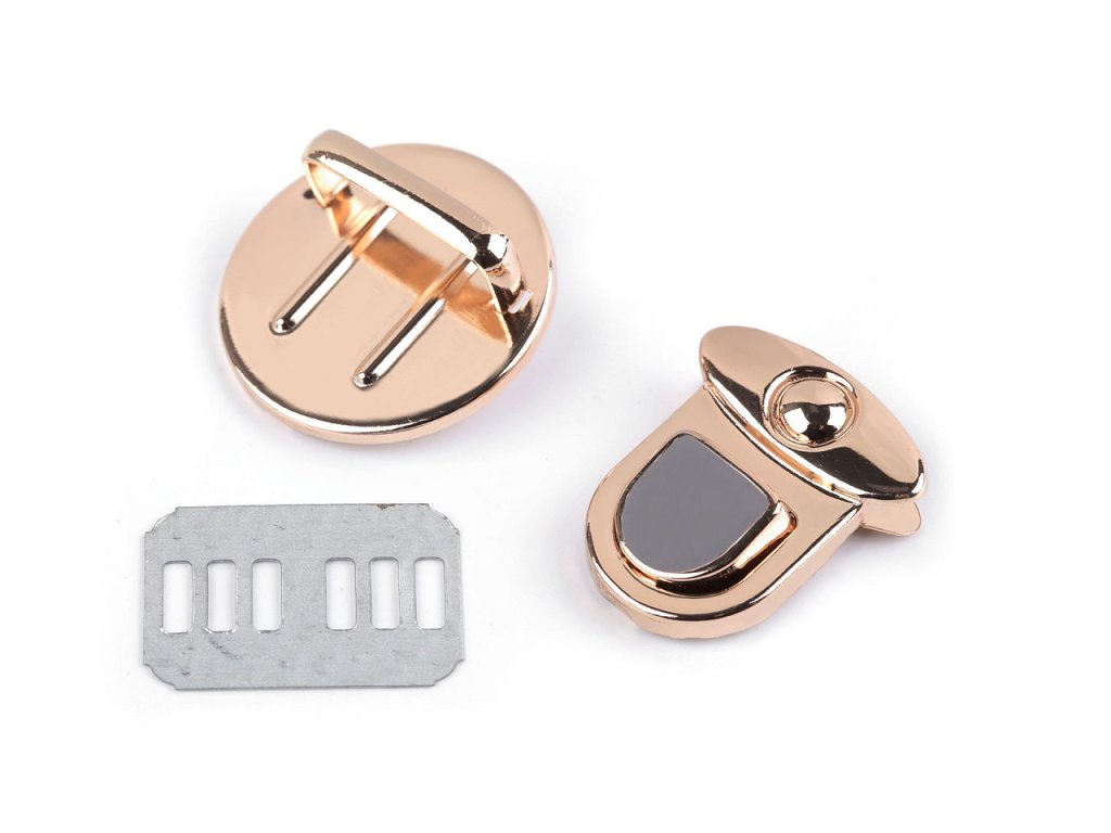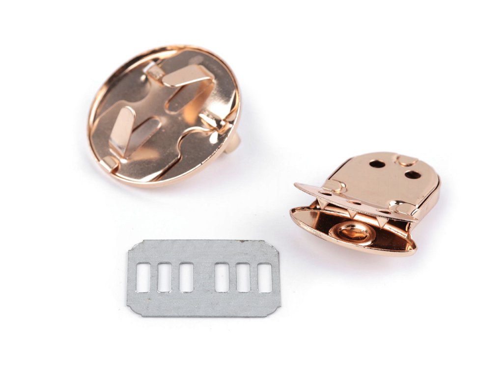 Kovové zapínání se skládá ze tří dílů. Plíšek se připevní na vnitřní část tašky, díl s nožkami na vnější část (nožky se zaháknou do plíšku a roztáhnou) a třetí díl se zoubky na její chlopeň. Díl na chlopeň se upevní tak, že rozevřete čelisti, na kterých jsou zoubky a mezi ně vložíte materiál, na který chcete zapínání upevnit. Následně čelisti sevřete, zoubky tak zamezí pohybu látky. Zapínání má zajímavý design - tlačítko na dílu na chlopeň je černé. Rozměry: - plíšek: 19 x 27 mm - díl s nožkami: Ø30 mm - díl na chlopeň: 25 x 30 mm Celkové rozměry po zapnutí jsou 30 x 34 mm.- Rozměry: 30 x 34 mm
