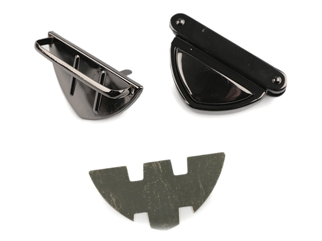 Klasické kovové zapínání využijete na tašku či kabelku. Skládá se ze tří dílů. Díl s nožičkami se připevní na vnější část. Nožky se zaháknou do druhého dílu, do plíšku, a roztáhnou. Třetí díl se zoubky se připevní na chlopeň tašky. Ten se upevní tak, že rozevřete čelisti, na kterých jsou zoubky, a mezi ně vložíte materiál, na který chcete zapínání upevnit. Následně čelisti sevřete, zoubky tak zamezí pohybu látky. Pak už jen stačí zasunout díly do sebe tak, až uslyšíte cvaknutí. Potom je teprve taška bezpečně uzavřena. Rozměry: - plíšek: 34 x 40 mm - díl s nožkami: 25 x 50 mm - díl na chlopeň: 30 x 52 mm Celkové rozměry po zapnutí jsou 35 x 52 mm.- Rozměry: 35 x 52 mm