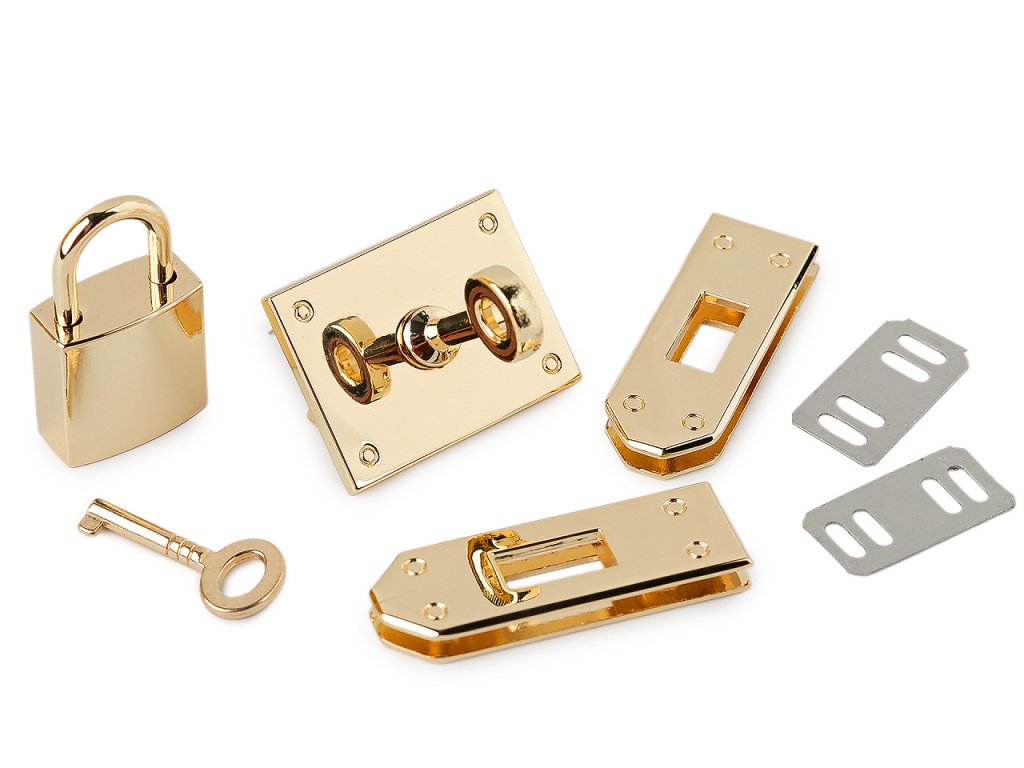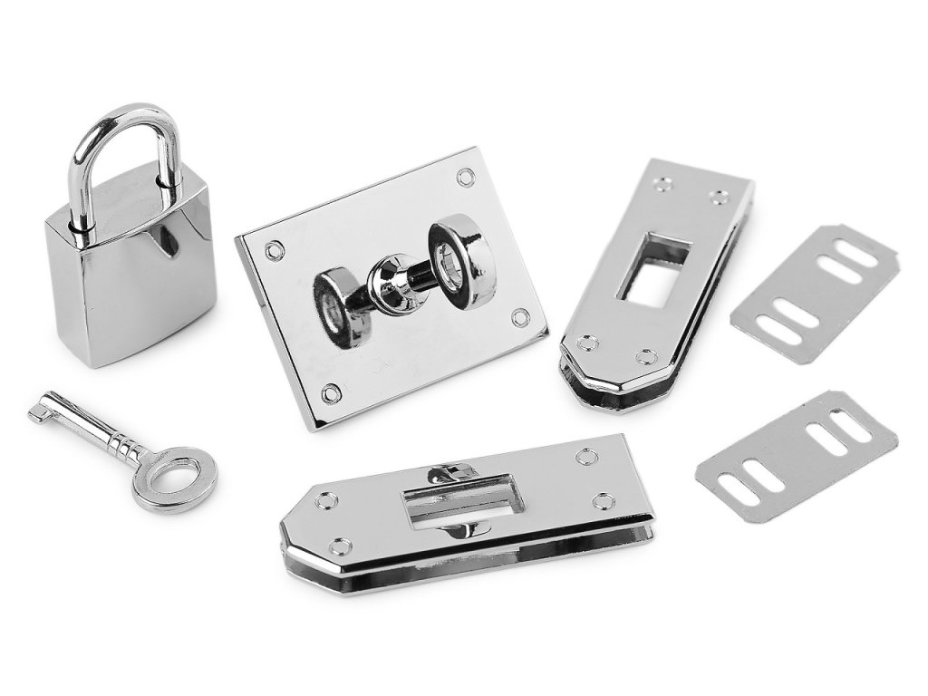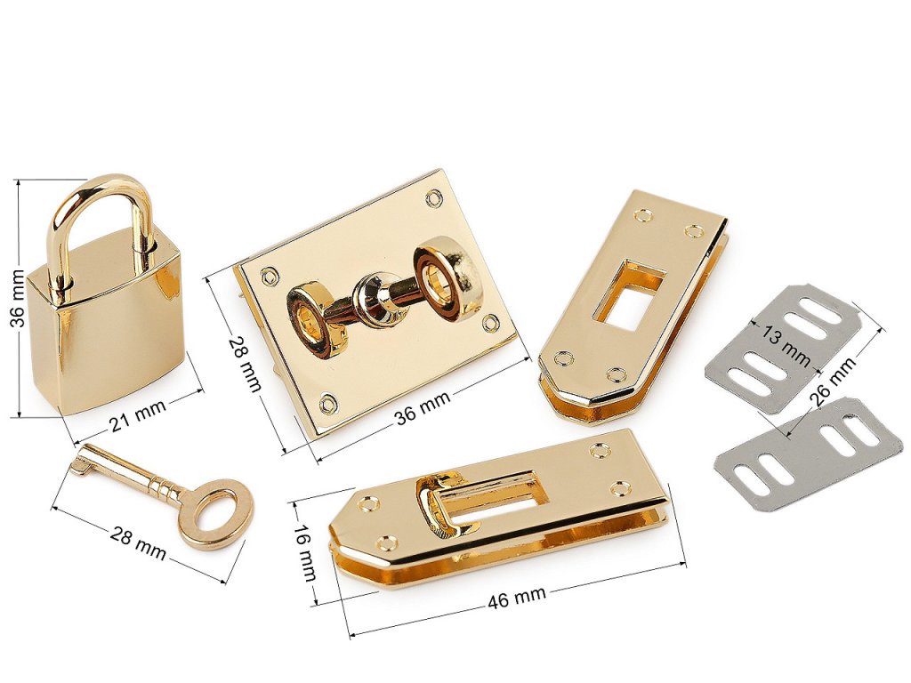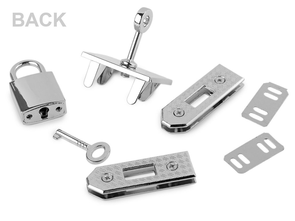 Speciální otočné zapínání se zámkem dodá každé kabelce a tašce nádech luxusu a elegance. Podobný styl zapínání můžete vidět u světoznámých značek. Vyniká originalitou a vysokou kvalitou. Zapínání se skládá ze čtyř hlavních dílů. Díl s tyčinkou a otočným očkem se připevňuje pomocí dvou plíšků, kterými ho k materiálu zajistíte. Další díly se připevňují pomocí přiložených šroubků na postranní řemínky kabelky. Řemínky jsou vhodné s šíří 15 mm.- Rozměry: 28 x 46 mm