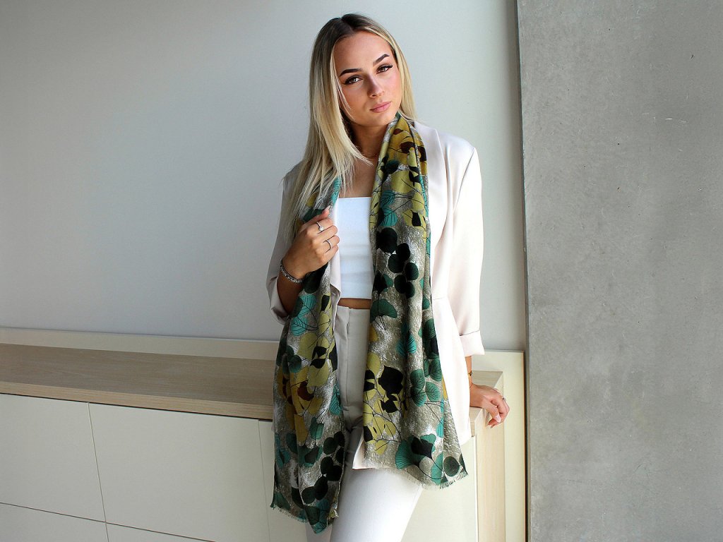 Velký šátek se vzorem ginkgo je příjemný a prodyšný, bude pohodlný v jakékoli situaci. Skvěle se kombinuje s jakýmkoliv outfitem. Ať už se chystáte do práce nebo na neformální setkání s přáteli, tento šátek je praktickým a stylovým doplňkem, který dodá vašemu vzhledu šmrnc. Na koncích je zakončený třásněmi dlouhými 1 cm. Některé šátky mohou mít špatné štítky, skutečné složení je polyester a viskóza. Omlouváme se za toto nedopatření a děkujeme za pochopení.- Šířka: 90 cm