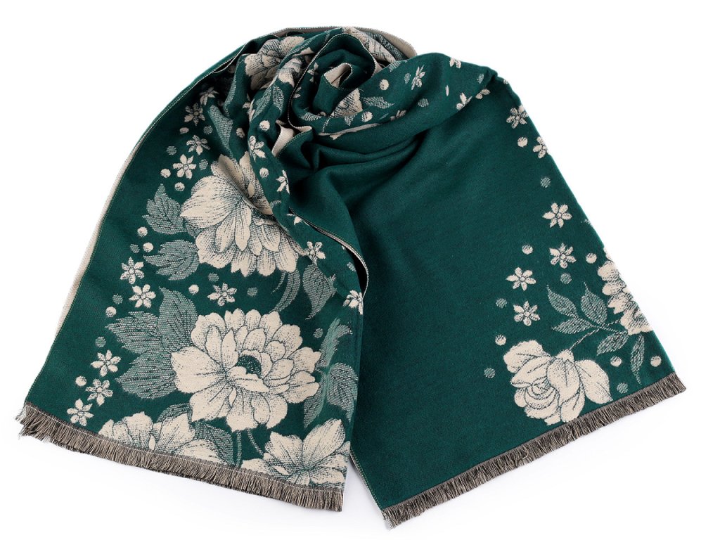 Velký luxusní šátek typu kašmír je ozdobený motivem s květy. Je vyrobený z hřejivého materiálu, který je příjemně hebký na dotek. Krásně vás zahřeje v chladném a sychravém počasí. Hodí se ke kabátu, bundě i svetru. Na koncích je zakončený třásněmi. Šátky typu kašmír jsou téměř dva metry dlouhé, skýtají široké možnosti při nošení. Můžete je nosit do práce i do společnosti, jejich elegantní vzhled váš outfit dokonale dozdobí. Některé šátky mají špatné štítky, skutečné složení je viskóza a polyester. Omlouváme se za toto nedopatření a děkujeme za pochopení. Šátek je oboustranný, ale z druhé strany má barvy přesně naopak, je světlý.- Šířka: 68 cm
