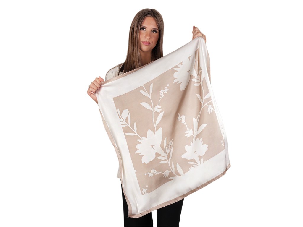Saténový šátek zaujme svým jemným leskem a luxusním vzhledem. Vzor s květy přináší nádech elegance a stylu, díky čemuž je ideálním doplňkem pro různé příležitosti. Šátek je lehký a příjemný na dotek, což zajišťuje komfortní nošení po celý den.- Šířka: 65 cm