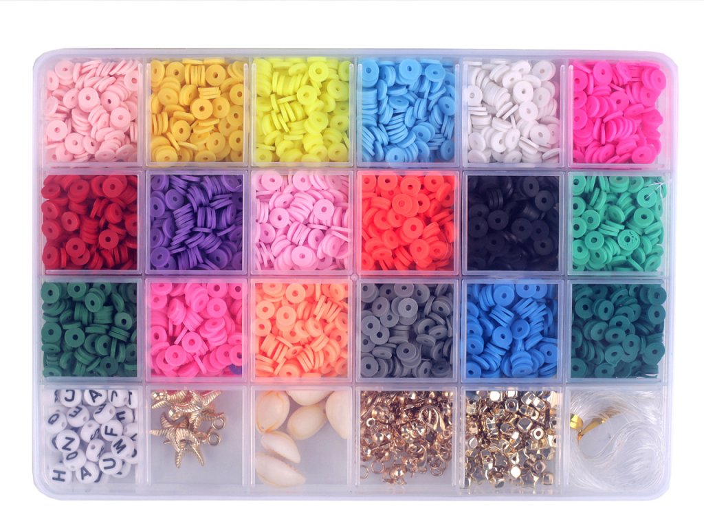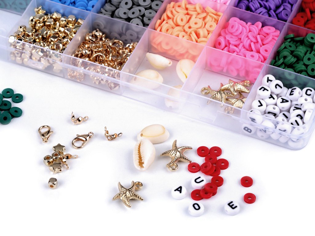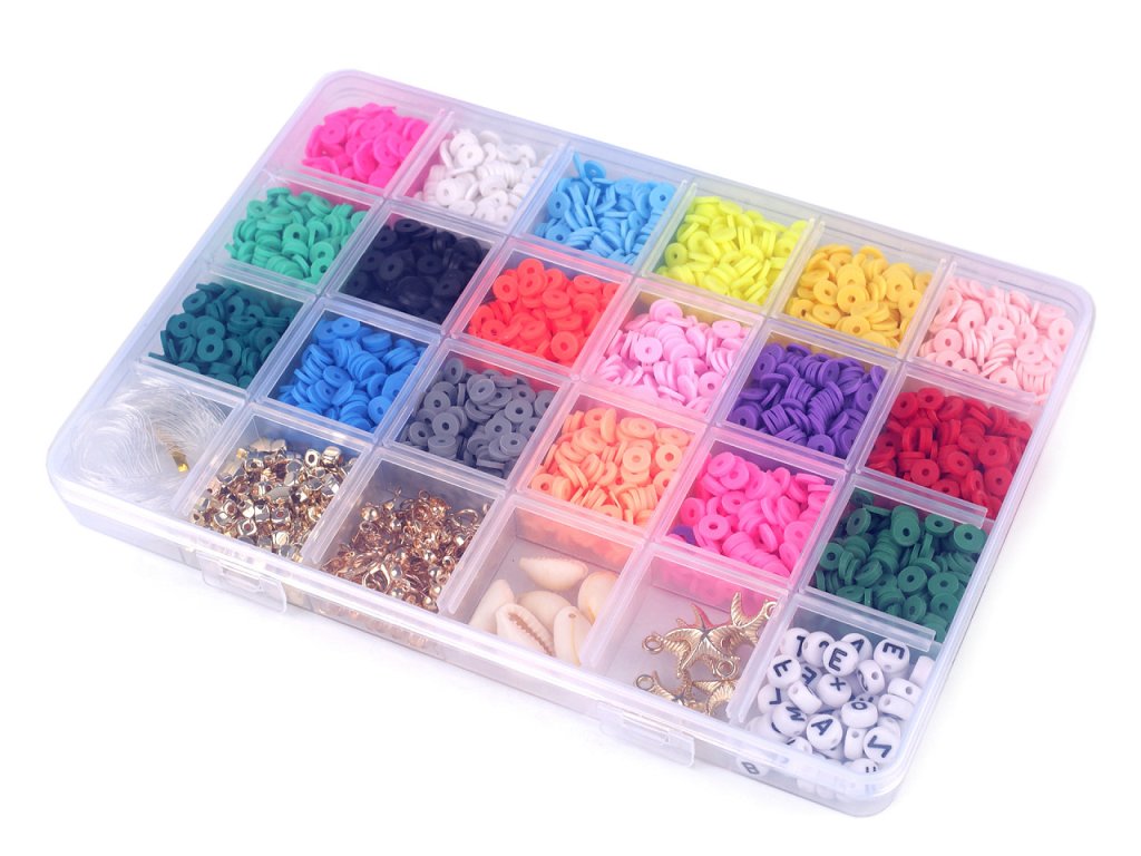 Sada silikonových placiček a plastových korálků a přívěsků v boxu potěší malé i velké korálkářky. Jsou skvělé na výrobu náramků a náhrdelníků, protože box obsahuje i bižuterní komponenty a silikonovou gumičku na navlékání. Box je rozdělený na 24 přihrádek. 18 přihrádek obsahuje silikonové placičky různých barev. 1 přihrádka obsahuje korálky s písmenky. 1 přihrádka obsahuje mix metalických hvězdiček, koleček a kostiček. 1 přihrádka obsahuje bižuterní komponenty - karabinky, kaloty a spojovací kroužky. 1 přihrádka obsahuje přívěsky hvězdic. 1 přihrádka obsahuje přívěsky mušlí. 1 přihrádka obsahuje kulatou silikonovou pruženku.- Průměr: 6 mm