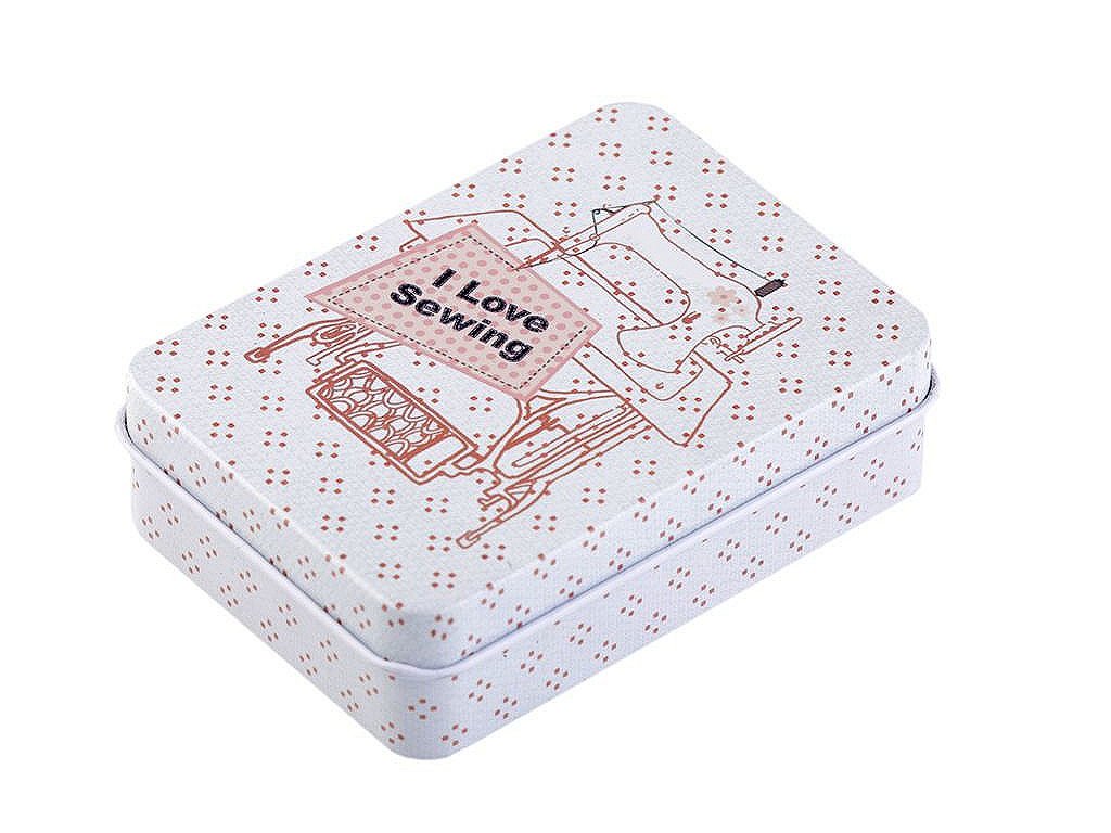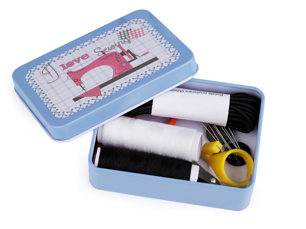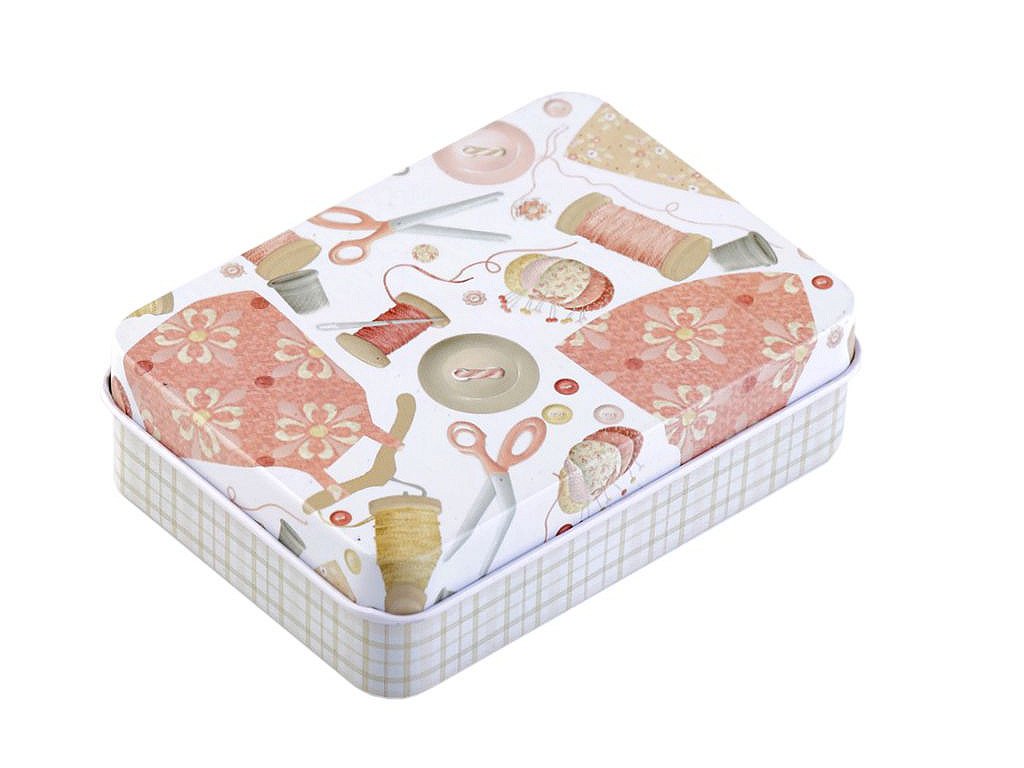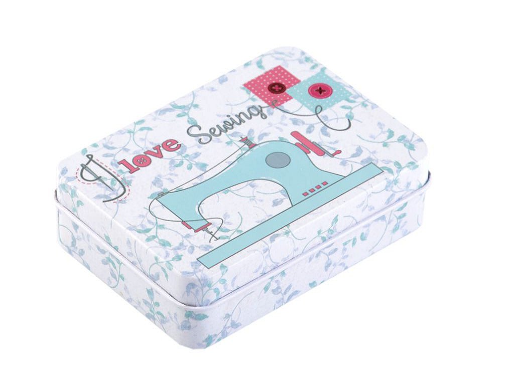 Šitíčko ve stylové plechové krabičce s krejčovským designem oceníte v každé domácnosti. Šitíčka máme dostupné v mixu variant. Obsah sady: - 2 ks polyesterové nitě v návinu 45 m (barva nití se může lišit) - malé cestovní nůžky - 1 ks spínací špendlík - 3 ks špendlík s plastovou hlavičkou - 3 ks jehly - 4 ks dvoudírkové knoflíky (barva knoflíků se může lišit) - náprstek s odstřihovačem nití - 3 m kulatá pruženka (Ø2 mm) - magnet- Rozměry: 6,5 x 9 cm