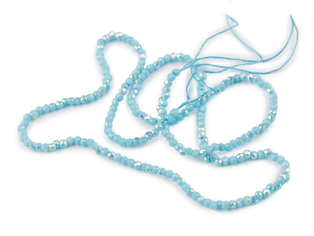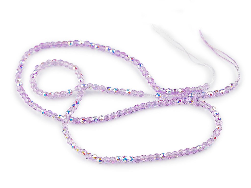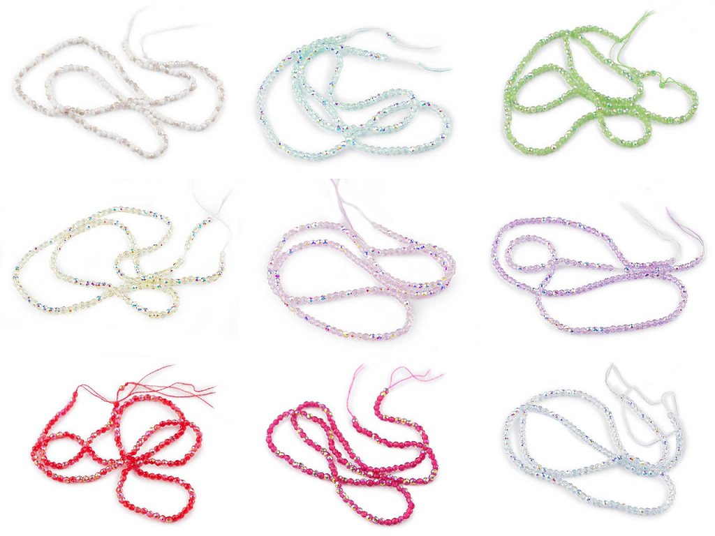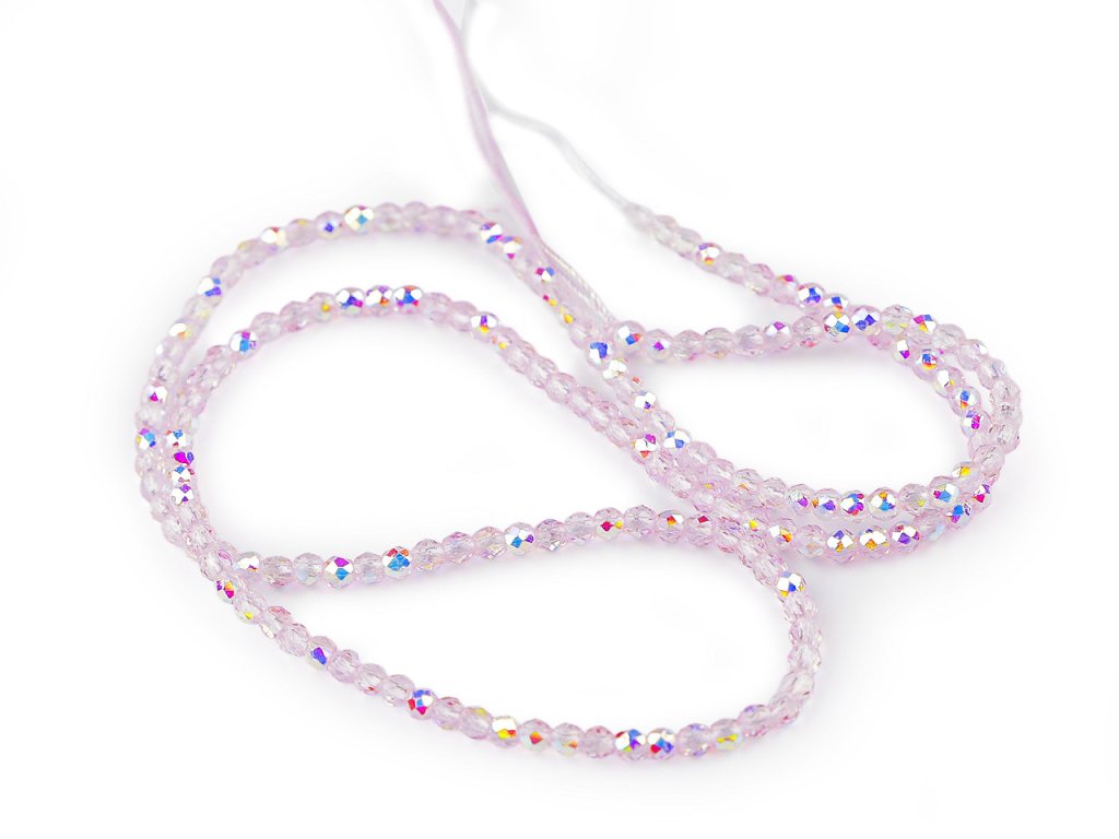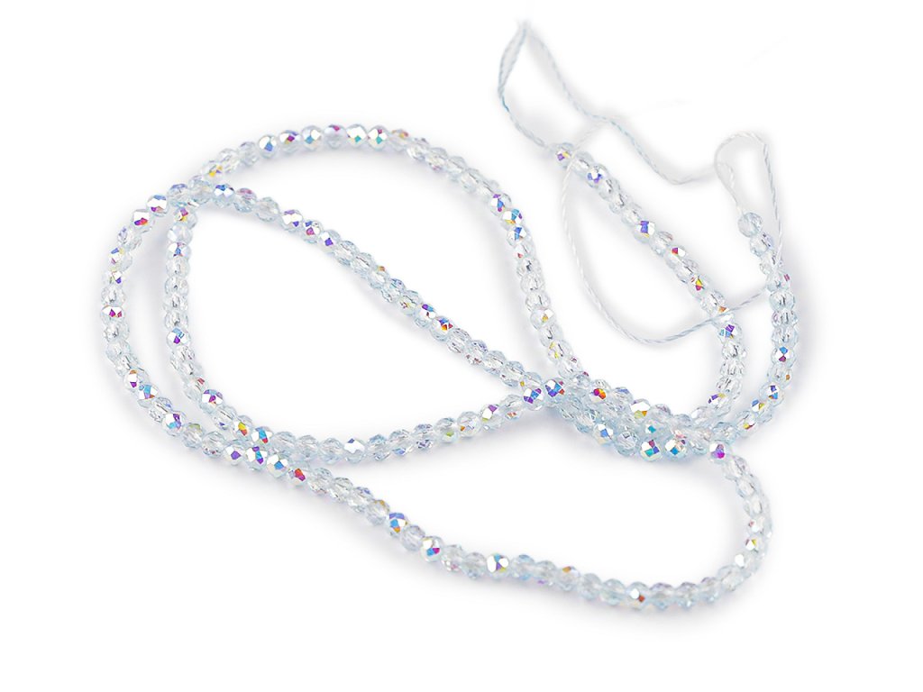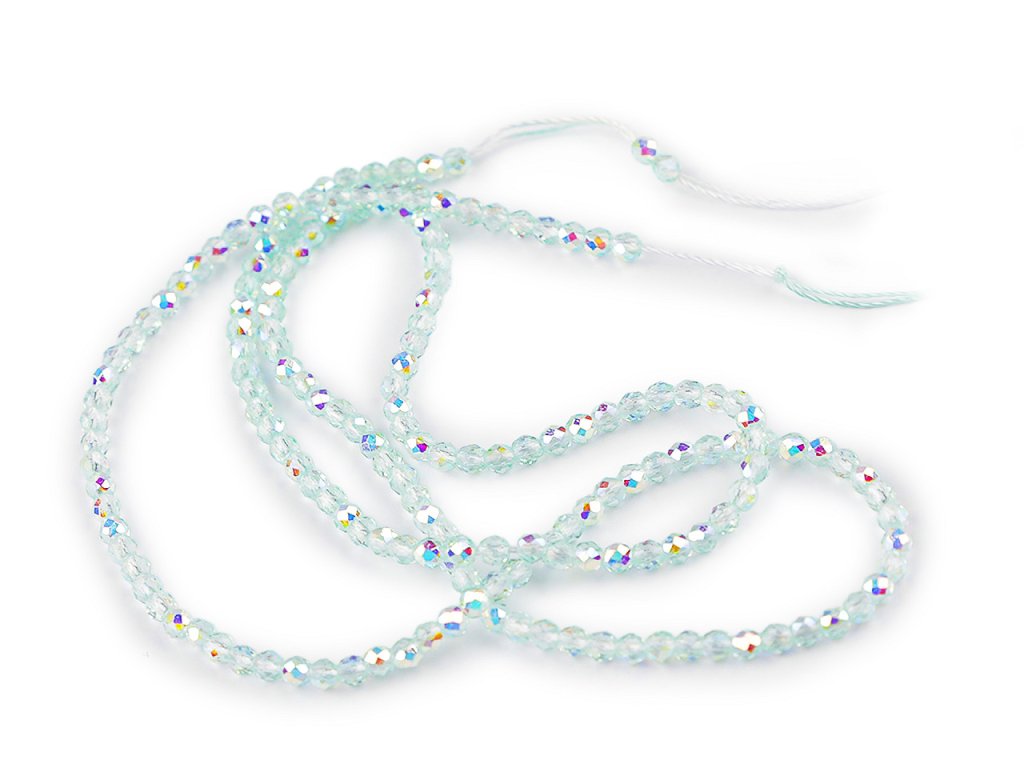 Skleněné korálky broušené ohňovky 2 mm s AB efektem, na šňůrce
