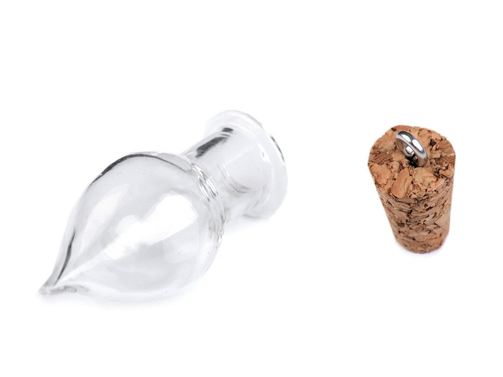 Působivá skleněná lahvička ve tvaru kapky na přípravu magických šperků. Po naplnění přísadami v podobě drobných korálků, glitrů, jemného barevného písku, úlomků minerálů, kamínků apod. doporučujeme korkovou zátku do hrdla vlepit, aby se při nošení lahvička samovolně neotevřela. Zátka je již opatřená očkem, vám zbývá jen zvolit návlekový materiál - řetízek, šňůrku nebo kůži. Náš tip: Do lahvičky můžete vložit malou srolovanou papírovou ruličku se vzkazem nebo přáním. Vnitřní průměr hrdla je 5,4 mm.- Rozměry přívěsku: 13 x 37 mm