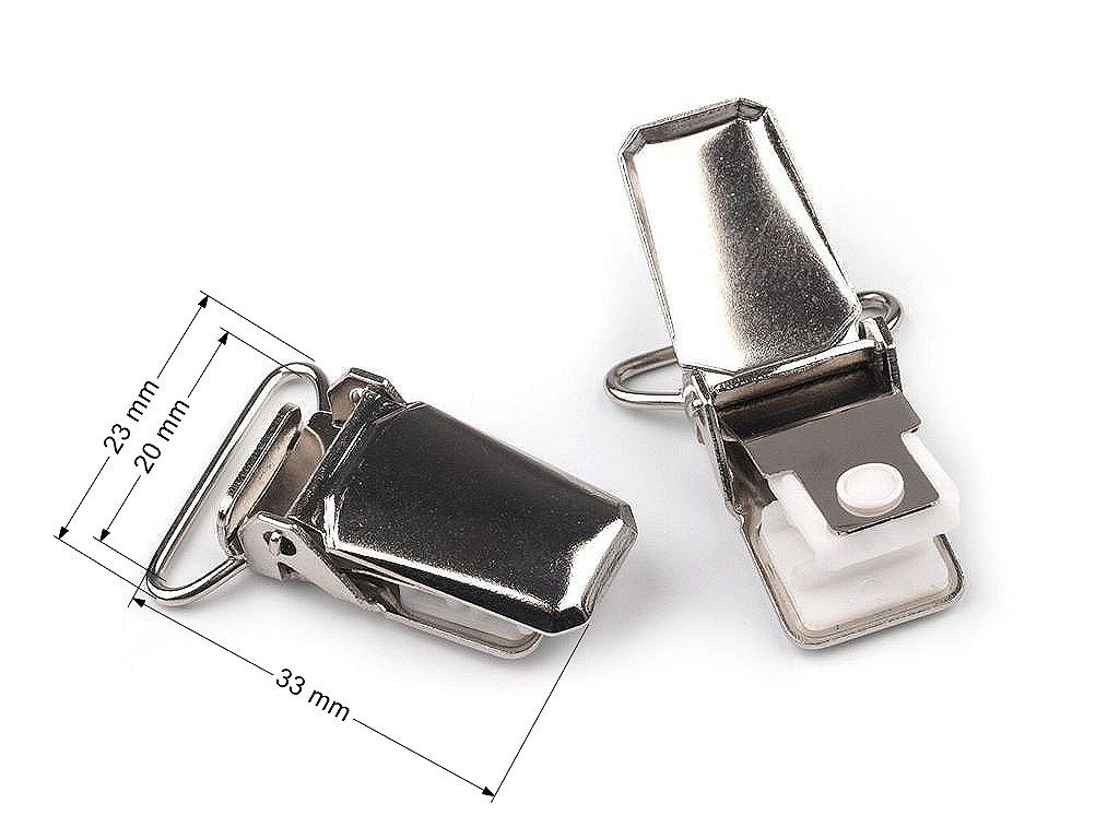 Šlový závěs použijete k mechanickému připevňování šlí k oděvu. Tento typ obsahuje bílé plastové vložky, které drží mnohem lépe než typy bez plastových vložek. Šlové závěsy nabízíme v provedení nikl.- Šíře průvleku: 20 mm