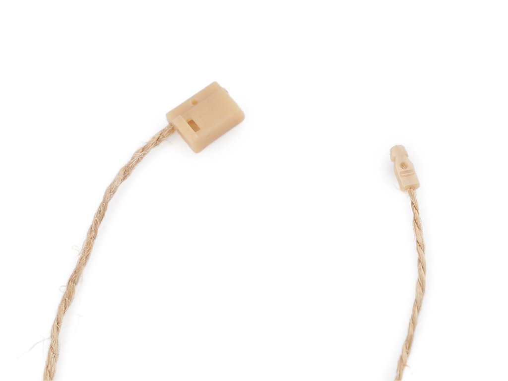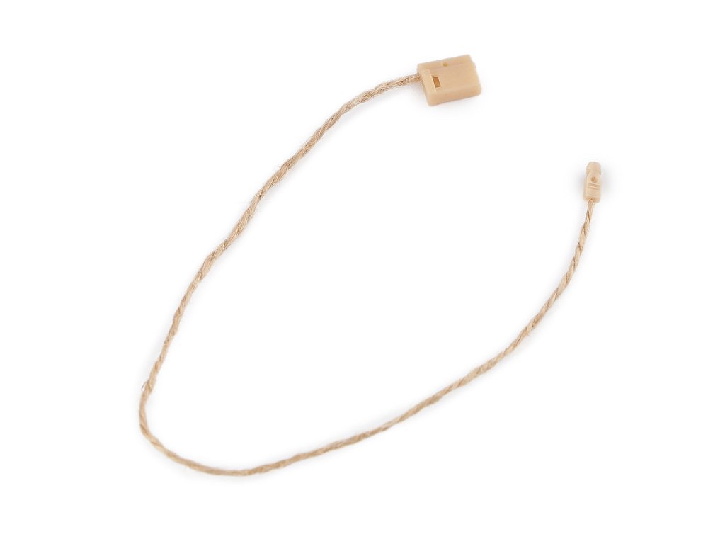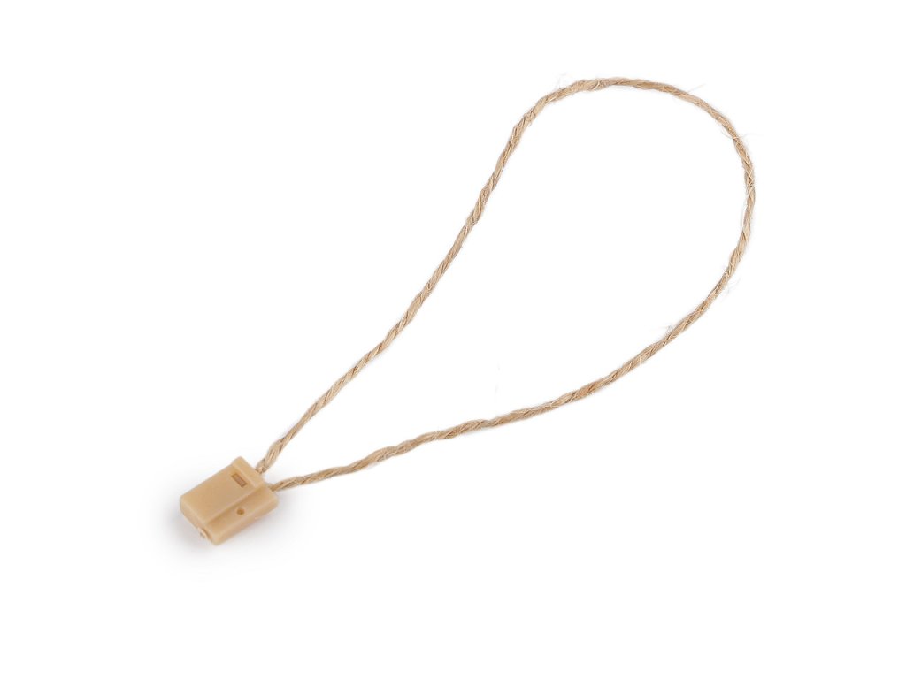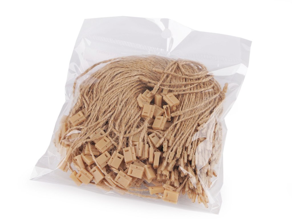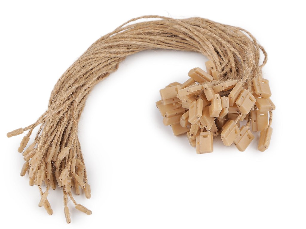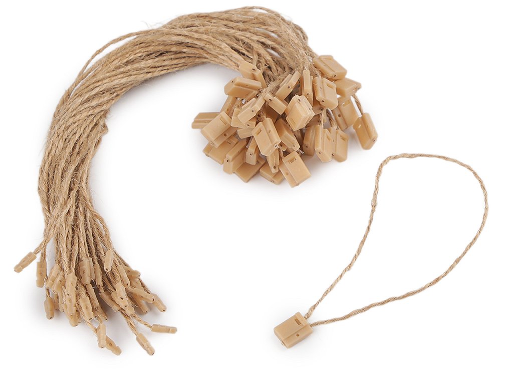 Jutová šňůrka s plastovou pojistkou je vhodná k připevnění visačky či cenovky na oděvy a doplňky, většinou tam, kde nelze použít špendlík kvůli poškození oděvu. Šňůrku připevníte jednoduše skrz pojistku, která má na sobě háčky, tudíž nehrozí otevření. Rozměry zapnuté pojistky jsou 7 x 10 mm.- Délka: 20 cm