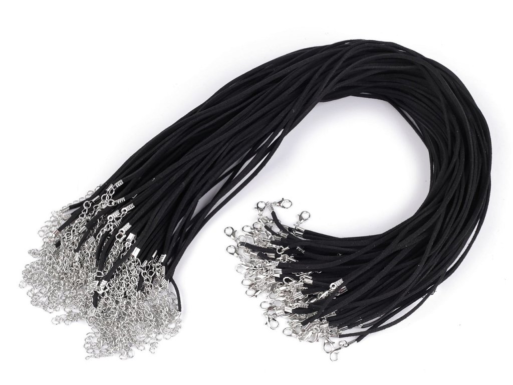 Šňůrka určená k zavěšení přívěsků. V případě, že přívěsek nebude možno díky koncovce navléci, tak lze kleštěmi pružinovou koncovku rozevřít, navléci přívěsek a opět koncovku uzavřít.U černých šňůrek je potřeba zamáčknout kleštičkami konce pružinek, šňůrky se lehce vyvlékají.- Šíře: 3 mm