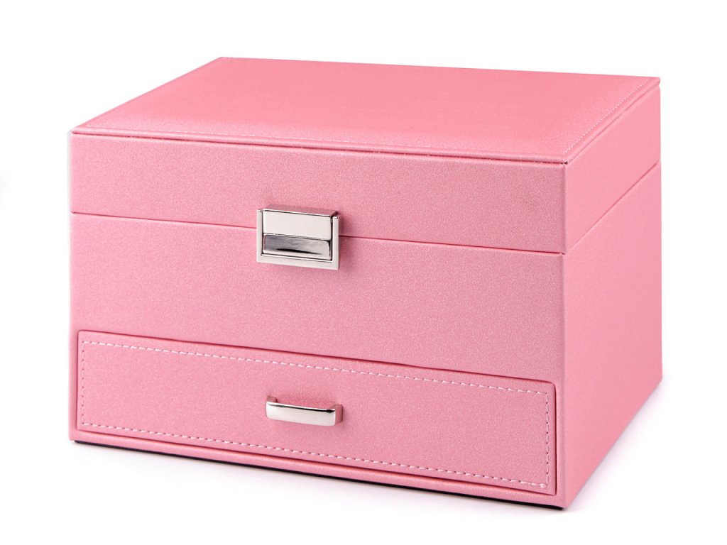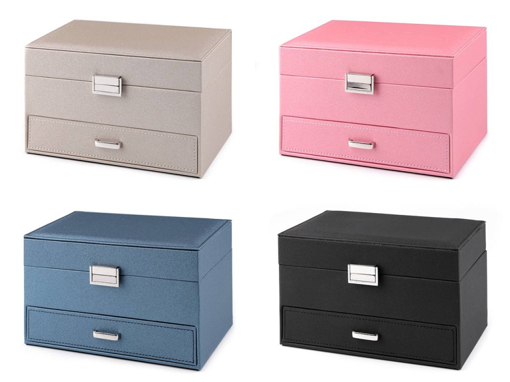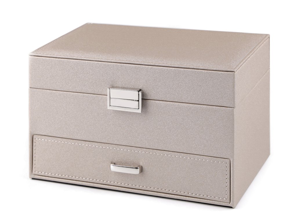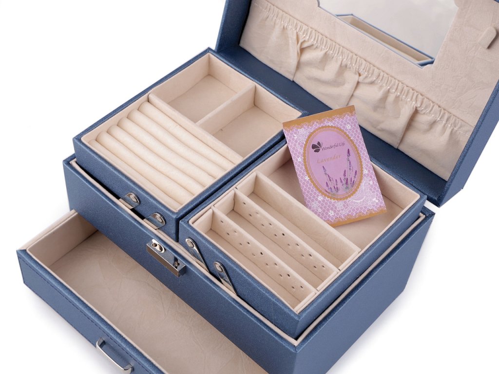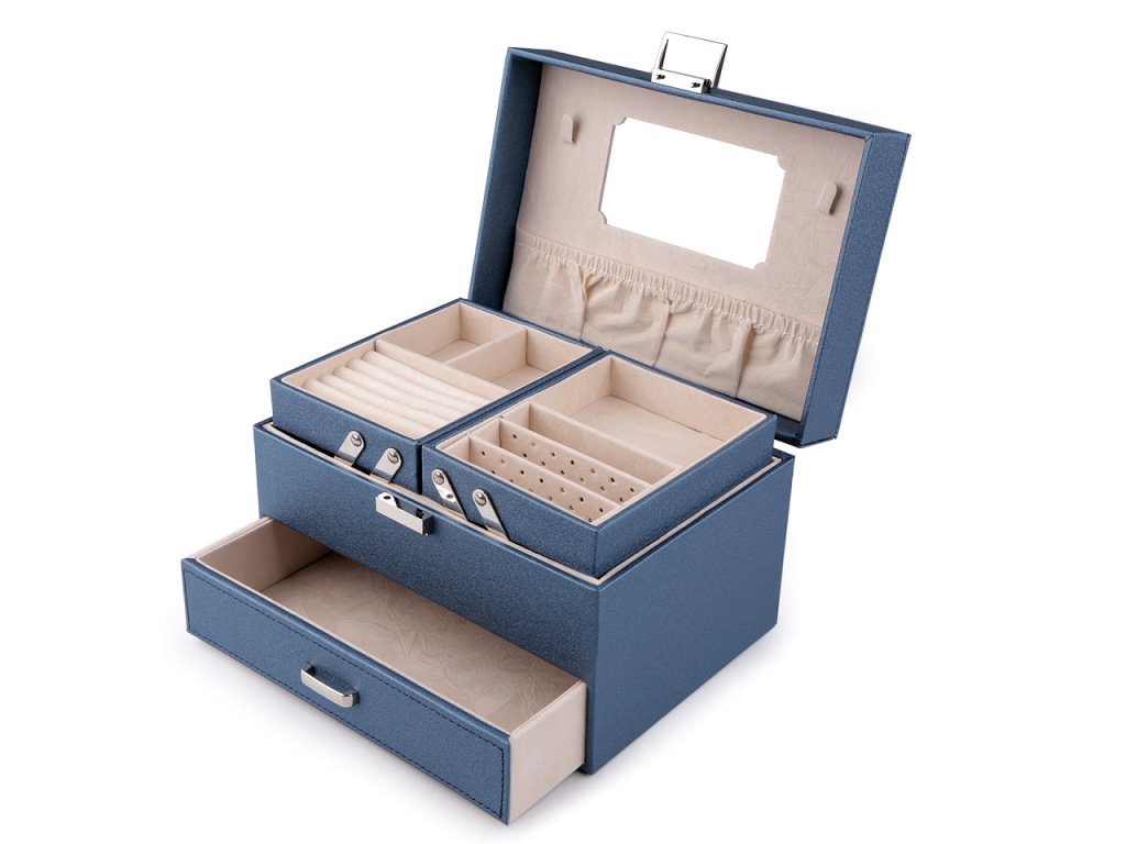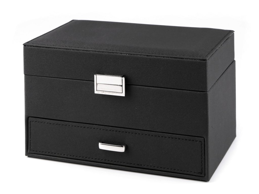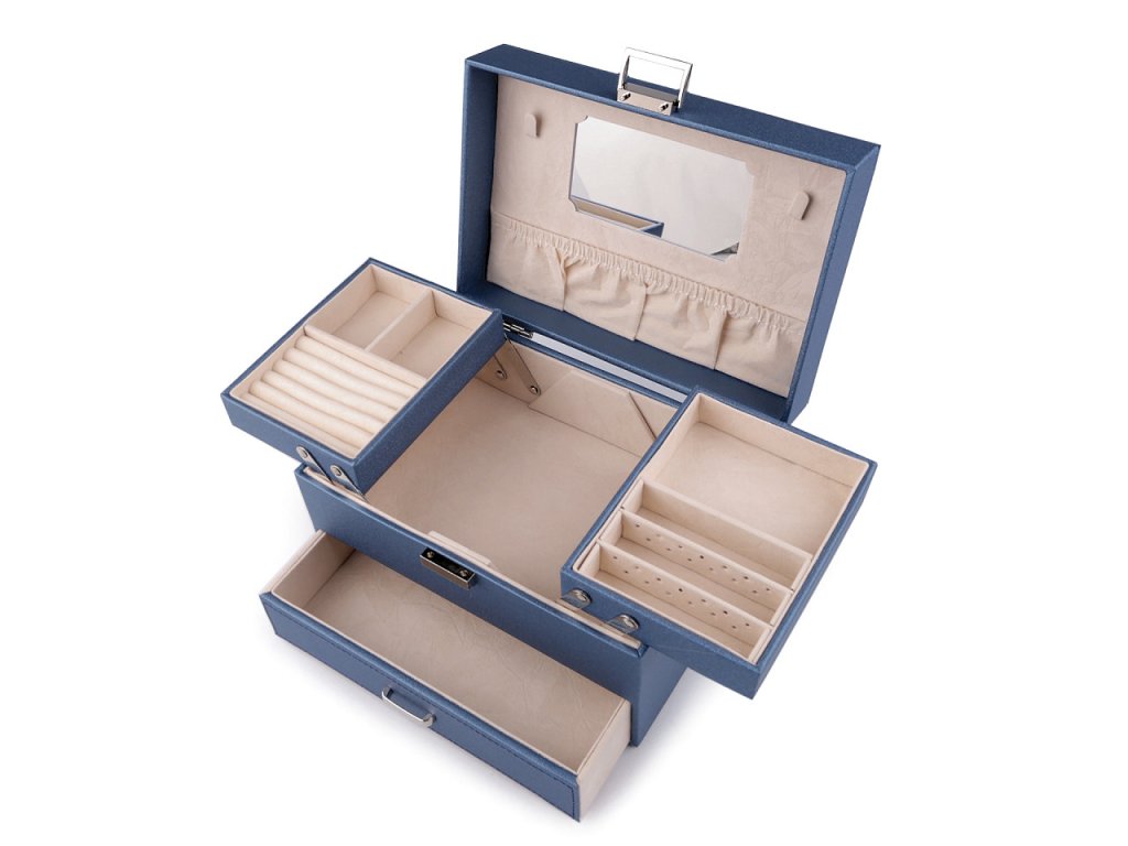 Elegantní 3 patrová šperkovnice na první pohled zaujme svým povrchem s decentním perleťovým leskem. Má kovové zapínání, spolehlivě ochrání šperky před nepříznivými vlivy okolí jako je světlo nebo vlhkost. Horní patro se rozkládá do stran. Obsahuje malé přihrádky, oddíl na prsteny a přepážky s dírkami na uložení náušnic. Prostřední patro má jeden velký prostor. Spodní patro tvoří vysunovací šuplík. Ve víku je zrcadlo, 2 háčky a kapsa. Šperkovnice má velice kvalitní a precizní provedení. Vnější potah je polyuretan, uvnitř je semiš. Šperkovnice č.4 - černá - má matný povrch bez perleťového lesku.- Šířka: 16 cm