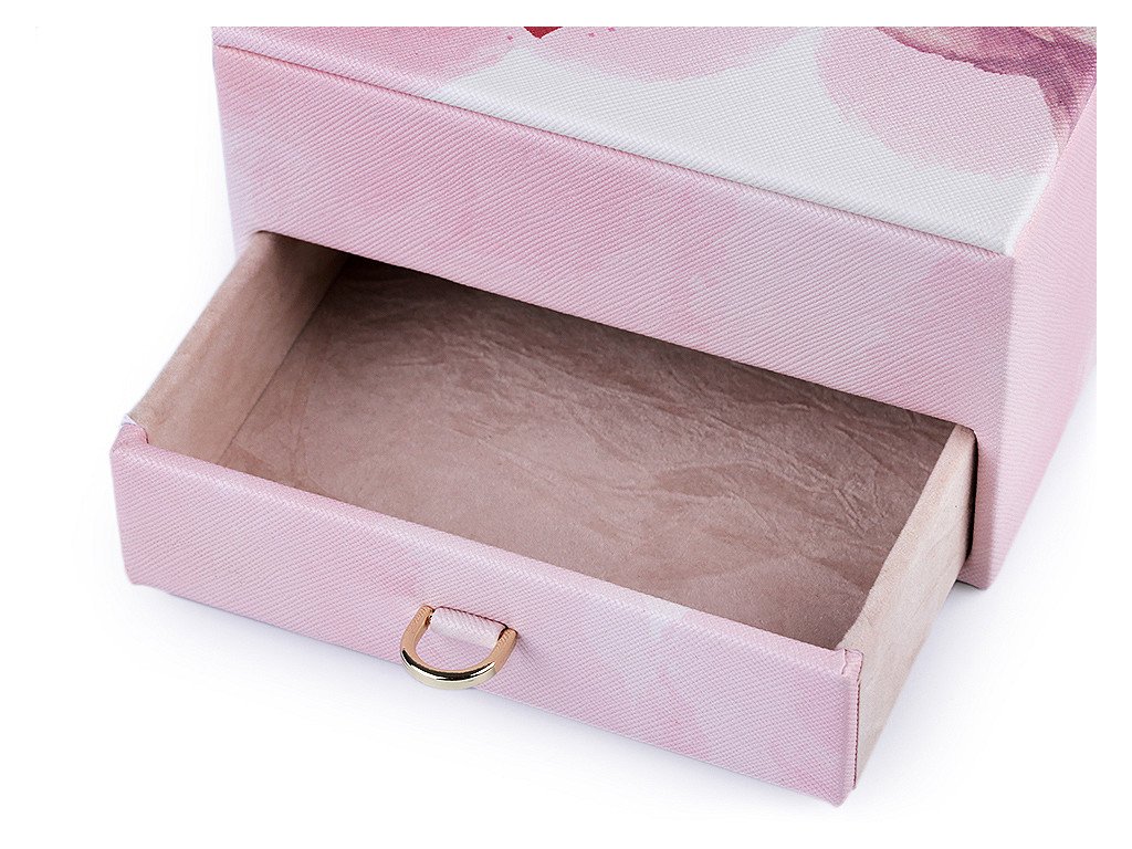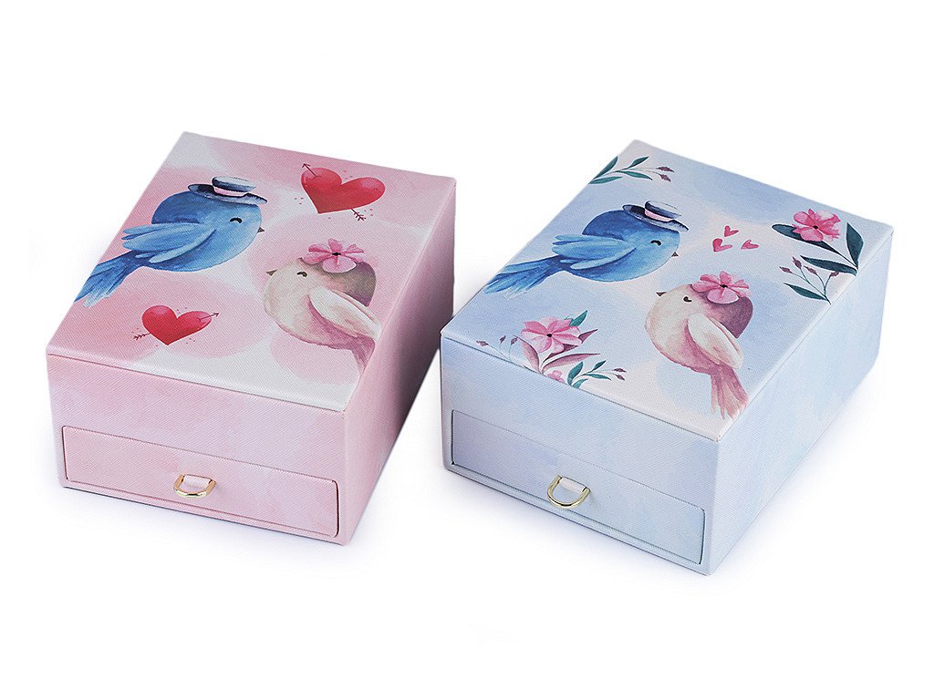 Šperkovnice s romantickým potiskem ptáčků spolehlivě ochrání šperky před nepříznivými vlivy okolí jako je světlo nebo vlhkost. Nahoře má odklápěcí víko se zrcadlem, ve spodní části je dlouhý šuplík. Pod víkem jsou 2 malé a velká přihrádka a oddíl na prsteny. Zrcadlo je odklápěcí, můžete ho pomocí přední hrany postavit (viz foto). Šperkovnice má velice kvalitní a precizní provedení.- Šířka: 14 cm