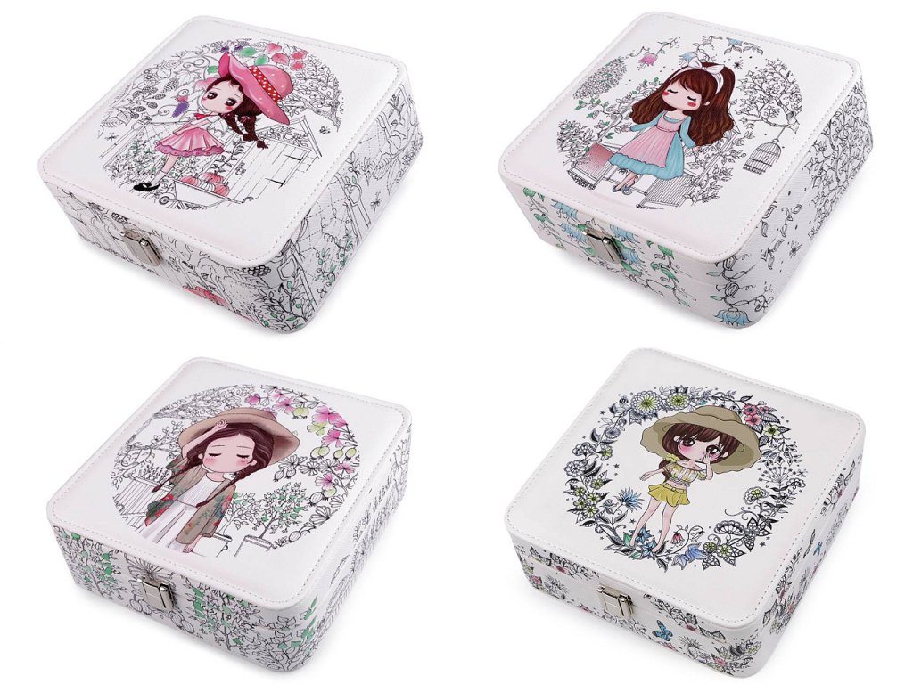 Šperkovnice s dívkou je vyrobená z kvalitní eko kůže. Má kovové zapínání. Spolehlivě ochrání šperky před nepříznivými vlivy okolí jako je světlo nebo vlhkost. Uvnitř šperkovnice je 6 přihrádek, oddíl na prsteny a zrcátko ve tvaru srdce. Šperkovnice má velice kvalitní a precizní provedení.Vzory šperkovnic v mixu se mohou lišit dle aktuálně dostupných skladových zásob, fotografie je pouze ilustrační.- Šířka: 18 cm