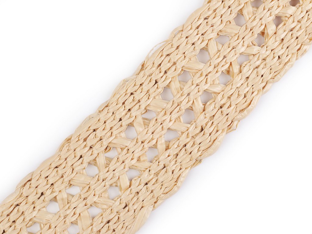 Splétaný popruh imituje slámu. Stylově ozdobí letní tašky, kabelky nebo klobouky. Zajímavě vynikne také jako pásek. Materiál, ze kterého je vyrobený, je pevný a odolný.- Šíře: 45 - 50 mm