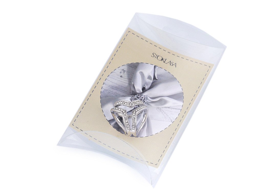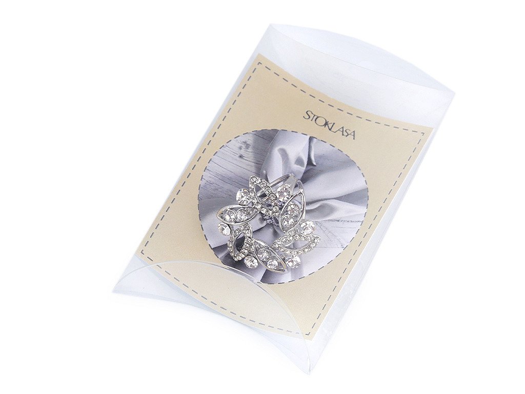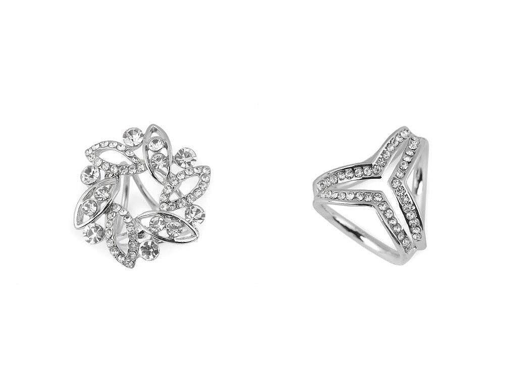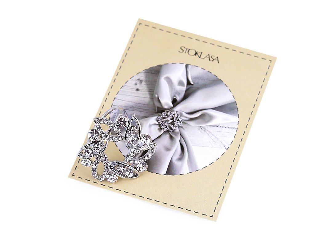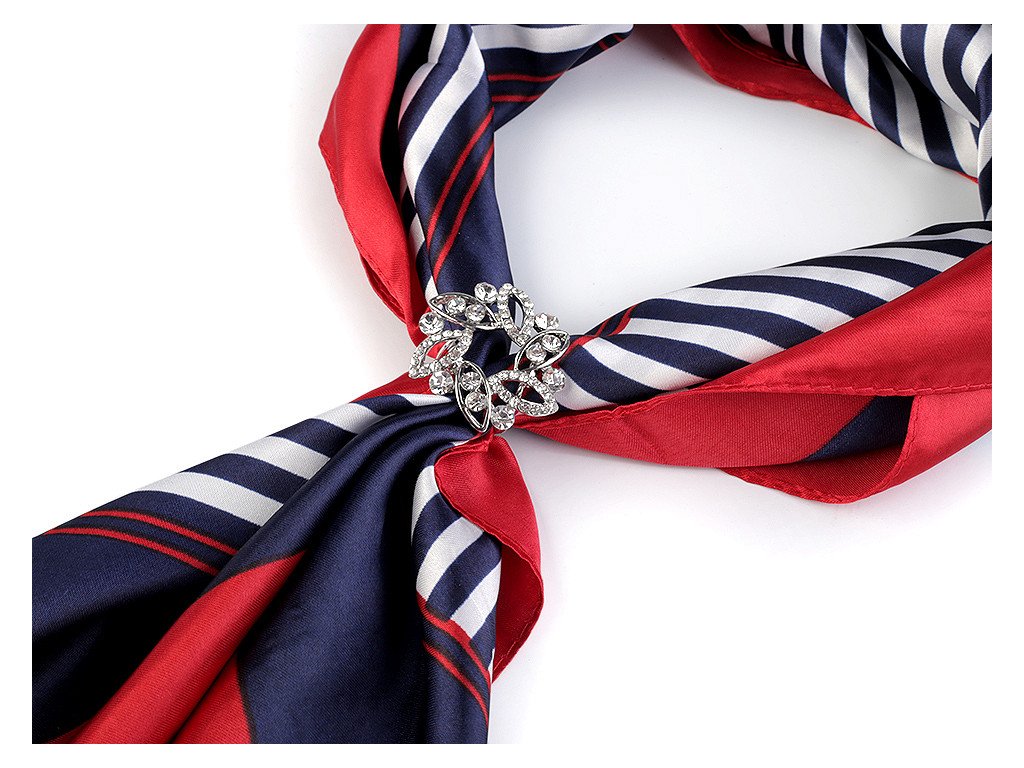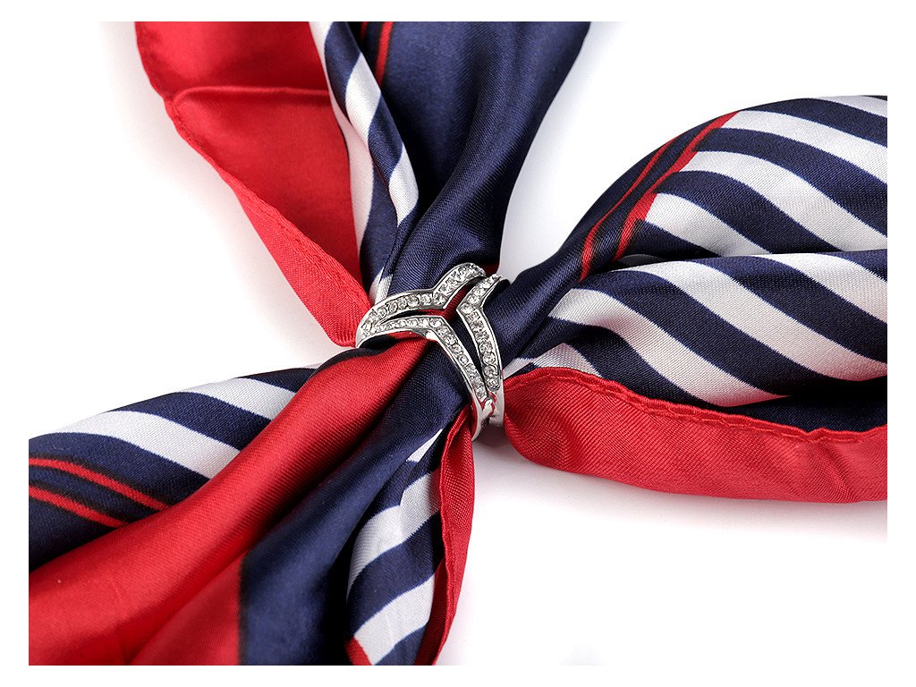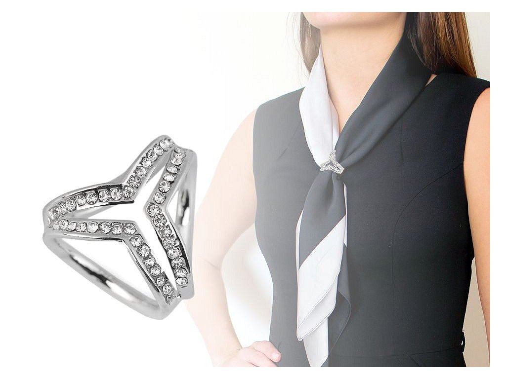 Ozdobnou sponu na šátek zdobí broušené kamínky, které jí dodávají eleganci. Nejlépe vynikne v kombinaci s jemným šátkem. Má celkem 3 průvleky, jež vybízejí k různým kombinacím nošení. Nejjednodušší použití je vložit cípy šátku do dvou průvleků z boku, z vnější strany a oba najednou vytáhnout dole ze zbývajícího třetího průvleku.- Rozměry: č. 1: 3,2 x 2,6 cm