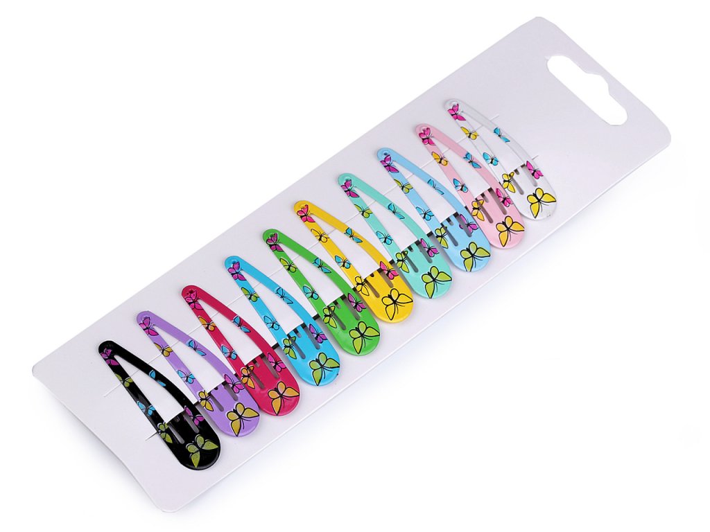 Mix barevných sponek s potiskem ocení všechny malé parádnice. Jsou vyrobené z kvalitního materiálu, který dlouho drží svůj tvar, funkčnost i barvy. Sponky jsou umístěné na papírové kartě s výsekem pro zavěšení a vystavení sponek. Na kartě je 10 sponek. Barvy jednotlivých sponek na kartě se mohou lišit.- Šířka: 1,4 cm