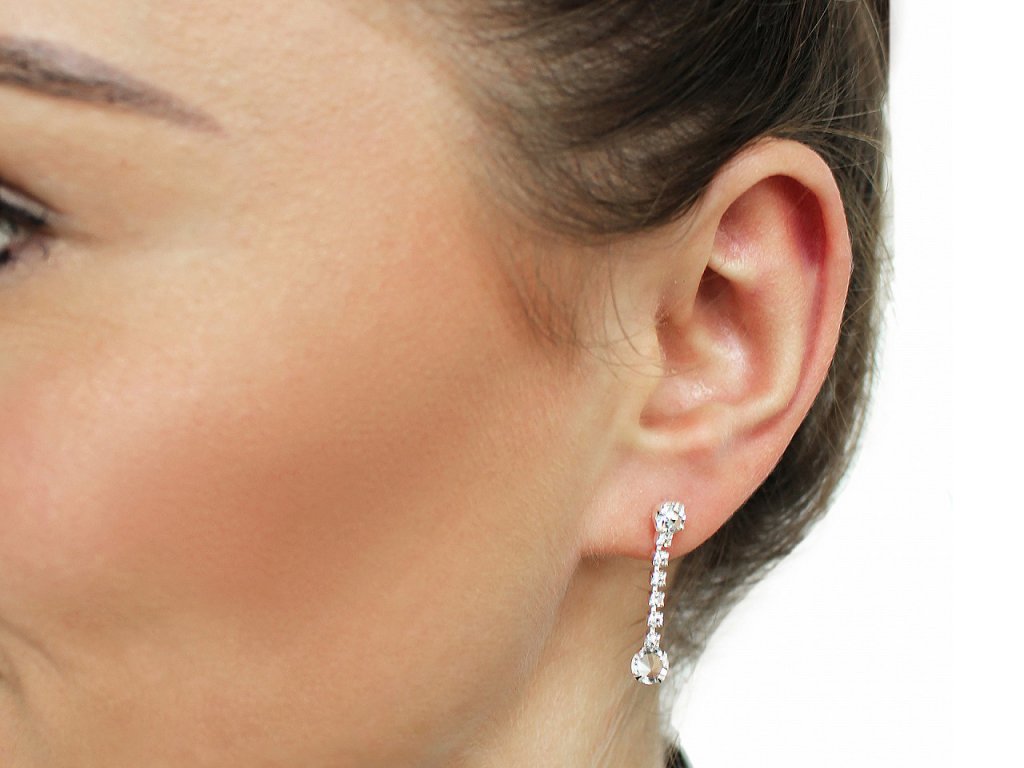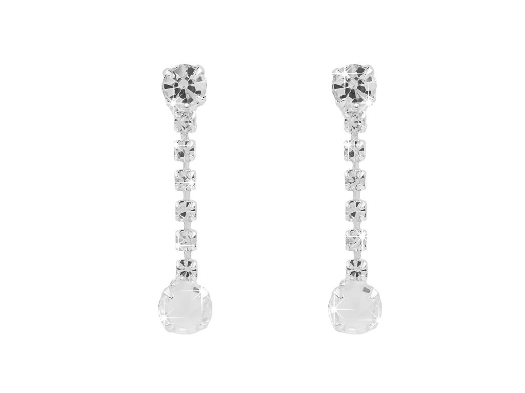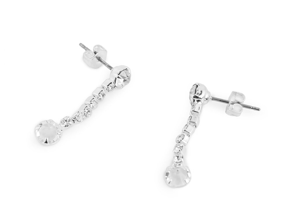 Dlouhé štrasové náušnice s broušenými kamínky jsou velice elegantní. Jsou decentní, ženy je ocení na běžný den i slavnostní události. Skleněné broušené kamínky prvotřídní české kvality jsou pevně zasazené do kovového lůžka, poutavě se třpytí. Kov na náušnicích má povrchovou úpravu se stříbrnou galvanizací. Náušnice jsou puzetového typu s kovovou zarážkou.- Šířka: 5 mm