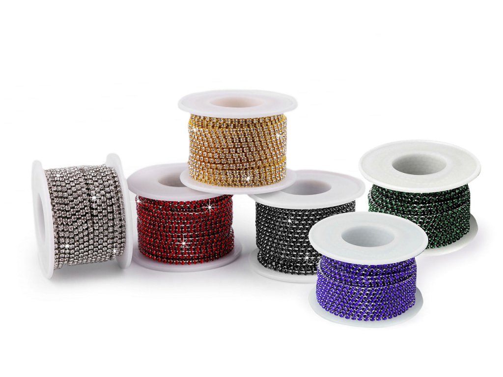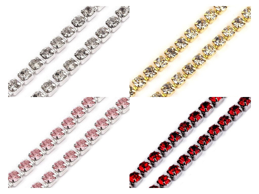 Luxusní bižuterní řetízkovou bortu zdobí třpytivé kamínky, které jsou vsazené do kovových plíšků. Použití: Borta vám elegantně ozdobí plesové a společenské šaty i různé oděvní doplňky, například klobouky, kabelky, psaníčka či boty. Na 10 cm kousku borty je 30 kamínků.- Šíře: 2,4 mm