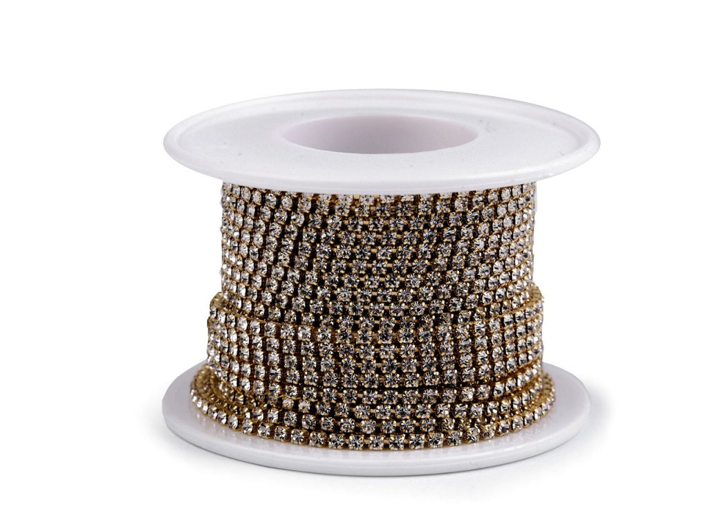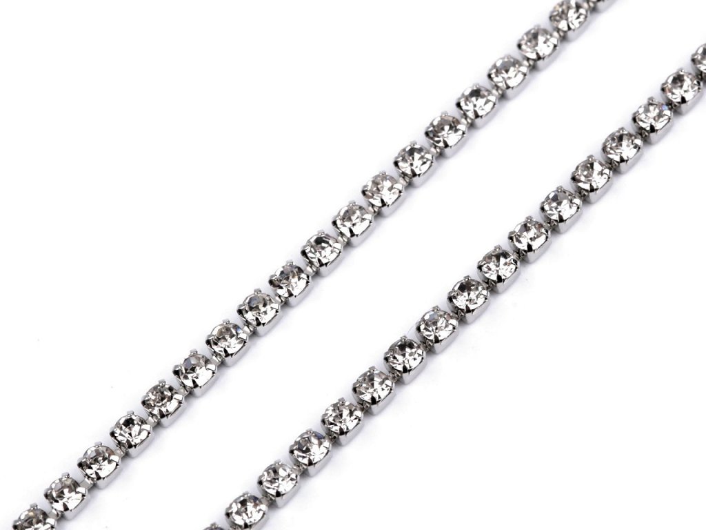 Luxusní bižuterní řetízkovou bortu zdobí třpytivé broušené kamínky vsazené do kovových kotlíků. Použití: Borta elegantně ozdobí plesové a společenské šaty i různé oděvní doplňky, například klobouky, kabelky, psaníčka či boty. Na 10 cm kousku borty je 37 kamínků.- Šíře: 2 mm