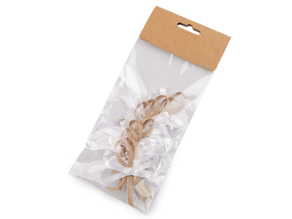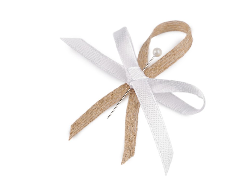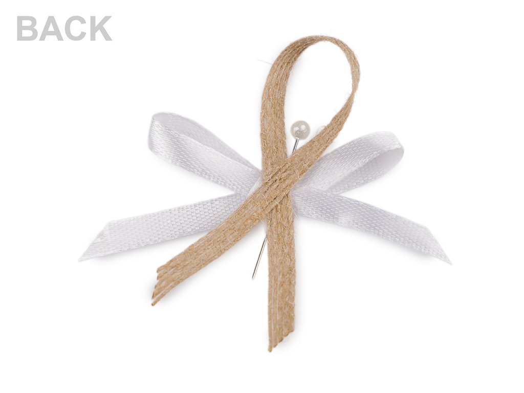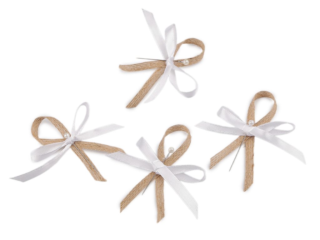 Svatební jutové mašličky v boho stylu jsou velice populární. Slouží především k ozdobení klopy ženicha a svatebčanů. Jsou kvalitní, ručně zpracované. Skládají se z jutové stuhy, saténové mašle a perleťového špendlíku. Mašličky můžete použít také k aranžování různých svatebních dekorací. Mašličky jsou zabalené po 10 ks v sáčku s papírovou kartou na zavěšení na prodejní stojan.- Rozměry: cca 7,5 x 7,5 cm