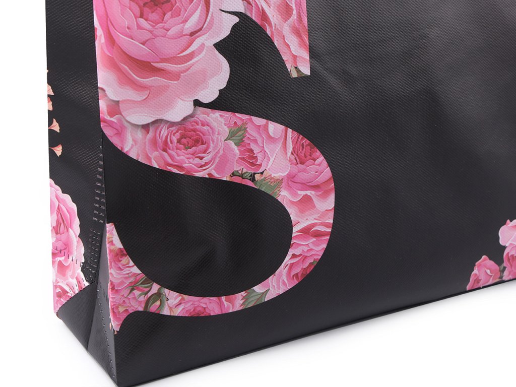 Do velké tašky z laminované netkané textilie s potiskem růží naskládáte plno věcí. Má dvě ucha, skvěle se složí třeba do kabelky. Díky opakovanému používání je šetrná k životnímu prostředí, stále častěji nahrazuje igelitové tašky. Hodí se k reklamním účelům. Není určená na těžké nákupy.- Rozměry (ŠxVxH): č. 1: 40 x 30 x 10 cm