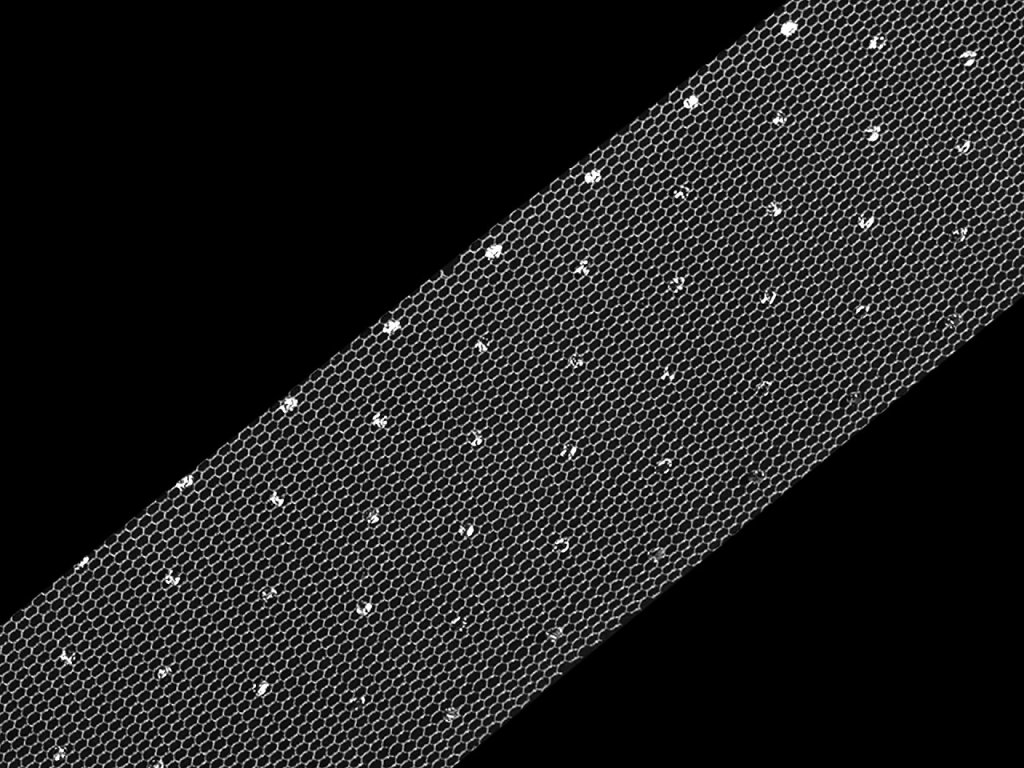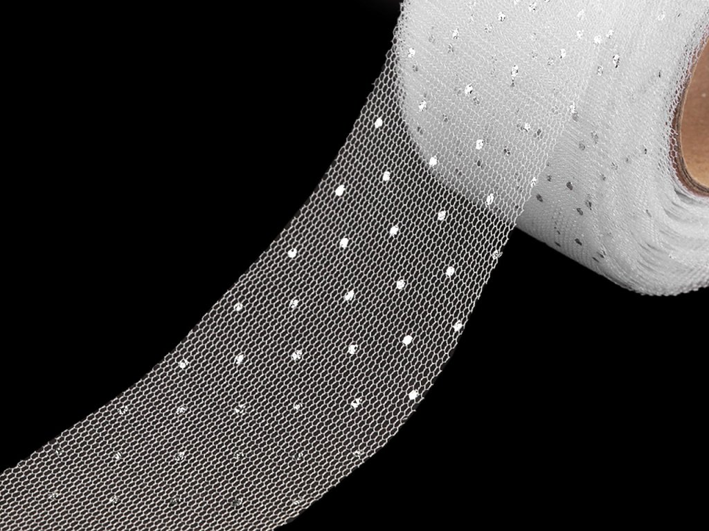 Elegantní tylová stuha je po celé délce ozdobená stříbrnými puntíčky, díky kterým se poutavě třpytí. Je oboustranná, velice poutavá, tyl dodává stuze vzdušnost a lehkost, což ji činí ideální pro různé dekorační účely. Použití: Stuhu využijete při různých slavnostních příležitostech (například na svatbě) jako dekoraci na židle, stoly, auta, manžety květin apod. Můžete z ní vyrobit i jednoduché mašle, stuha dobře drží tvar. Je také vynikající na balení dárků, kterým dodá luxusní vzhled.- Šíře: 40 mm