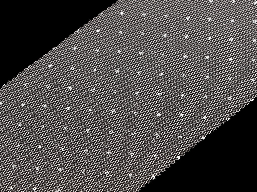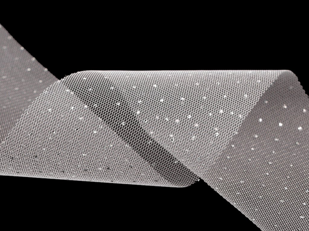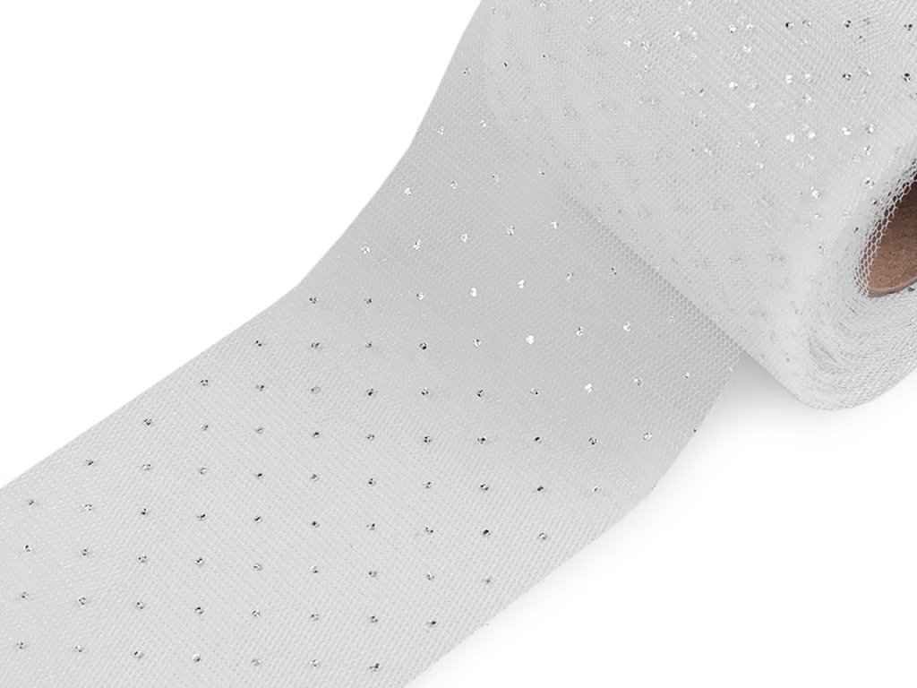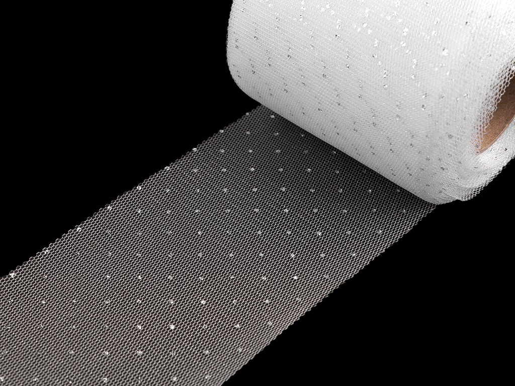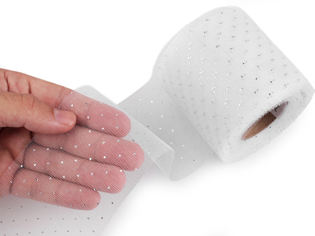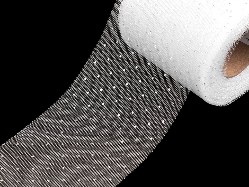 Široká tylová stuha je po celé délce ozdobená stříbrnými puntíčky, díky kterým se poutavě třpytí. Je oboustranná, velice poutavá, tyl dodává stuze vzdušnost a lehkost, což ji činí ideální pro různé dekorační účely. Použití: Stuhu využijete při různých slavnostních příležitostech (například na svatbě) jako dekoraci na židle, stoly, auta, manžety květin apod. Můžete z ní vyrobit i jednoduché mašle, stuha dobře drží tvar. Je také vynikající na balení dárků, kterým dodá luxusní vzhled.- Šíře: 75 mm