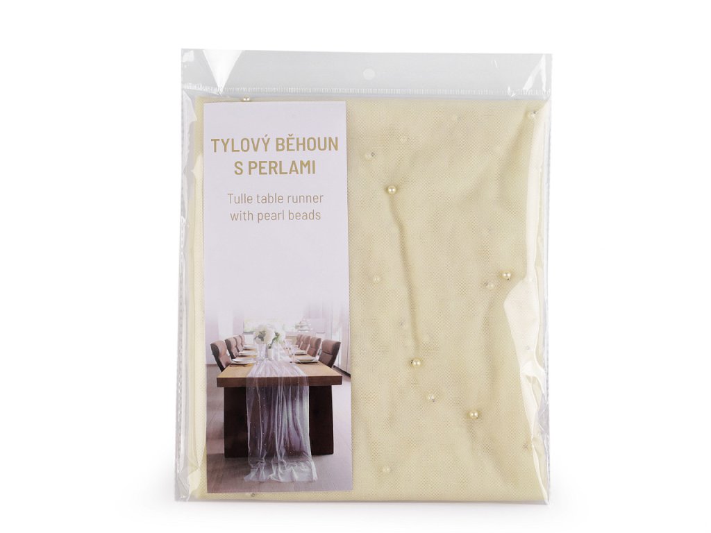 Slavnostní tylový běhoun s perlami je elegantní dekorací, která dodá každé slavnostní události nádech luxusu. Poslouží k ozdobení středové části stolu. Využijete ho na svatbách a různých oslavách, kterým dodá romantickou atmosféru. Může být i ozdobou pro předsvatební hostinu, recepci, party či jiné typy oslav, kde chcete vytvořit nezapomenutelnou atmosféru. Je jednostranný, perly jsou pevně přinýtované, mají průměr 6 mm. Pro větší efekt doporučujeme dát na stůl 2 ks běhounu.- Šíře: 80 cm