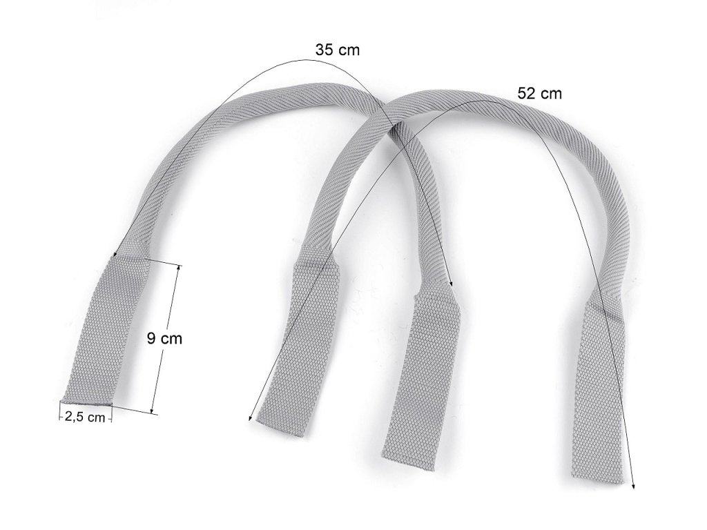 Textilní polypropylenová ucha využijete na pletené a textilní tašky, kabelky nebo batohy. Uvnitř mají měkkou výplň, díky které poskytují komfortní úchop. K výrobku se přišívají. Celková délka ucha je 52 cm. Délka úchopové části je 35 cm. Délka části, která se přišívá je 9 cm. Její šířka je 2,5 cm.- Délka: 35 cm