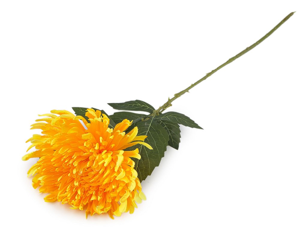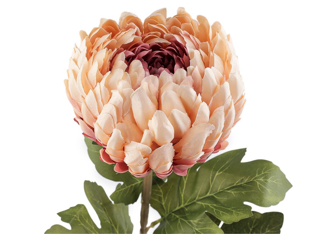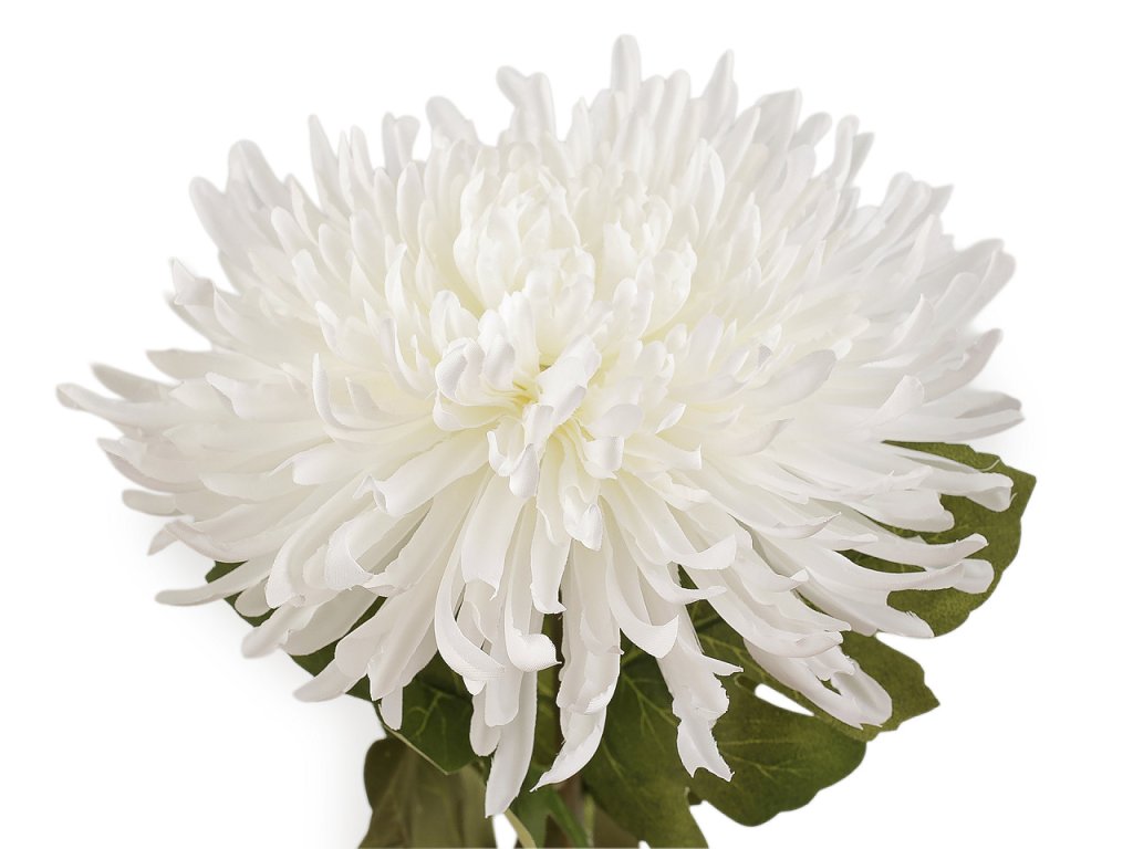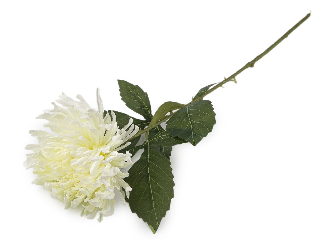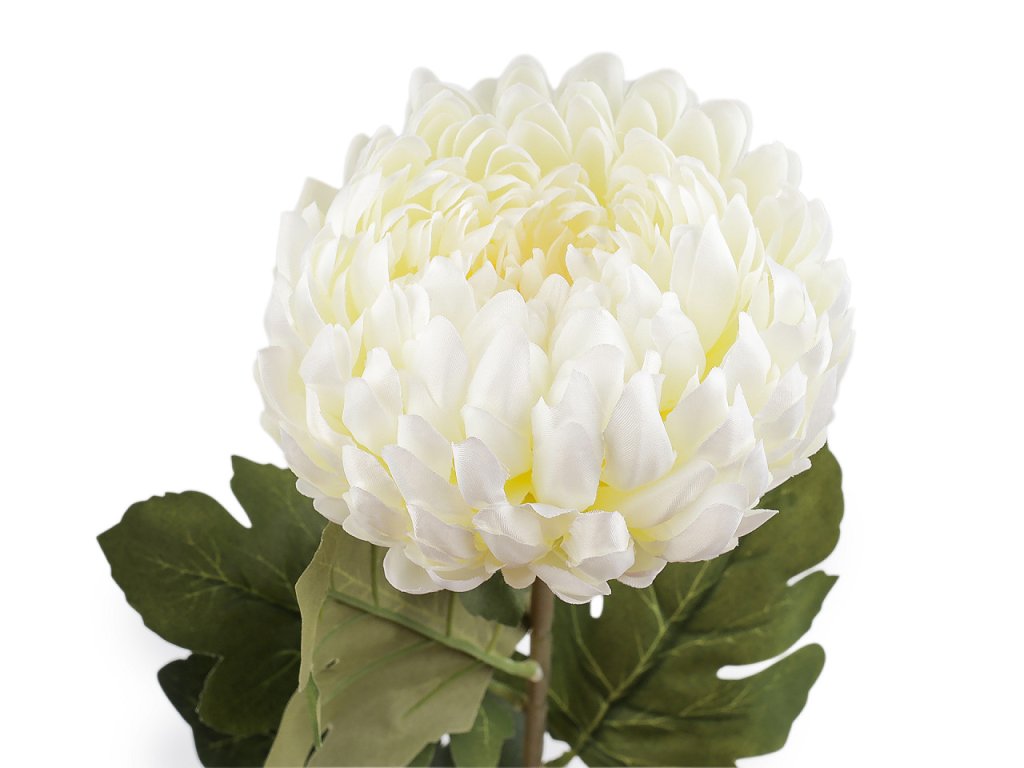 Umělá chryzantéma se pyšní svou velikostí. Květ a listy jsou textilní. Uvnitř stonku je drát. Chryzantémy vyniknou v jednoduché váze, ale také je využijete k aranžování květinových vazeb, věnců i ikeban.- Délka: cca 70 cm