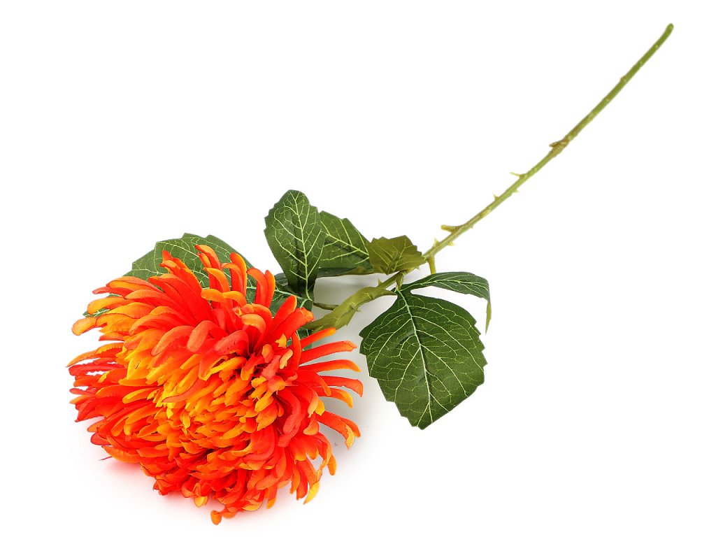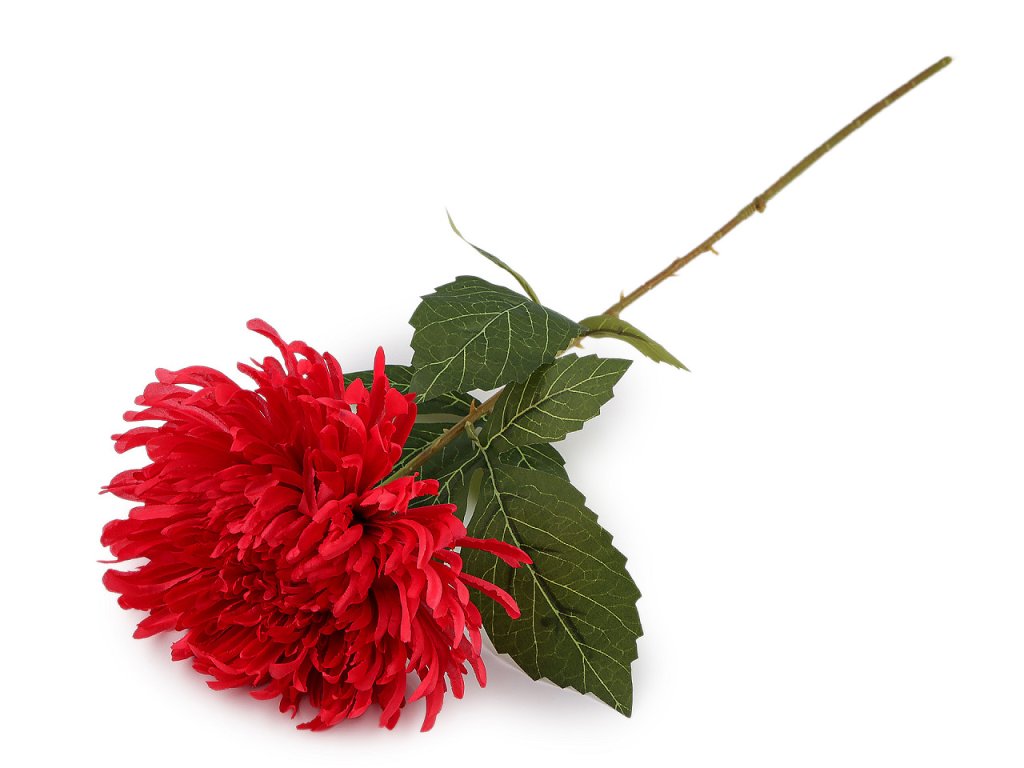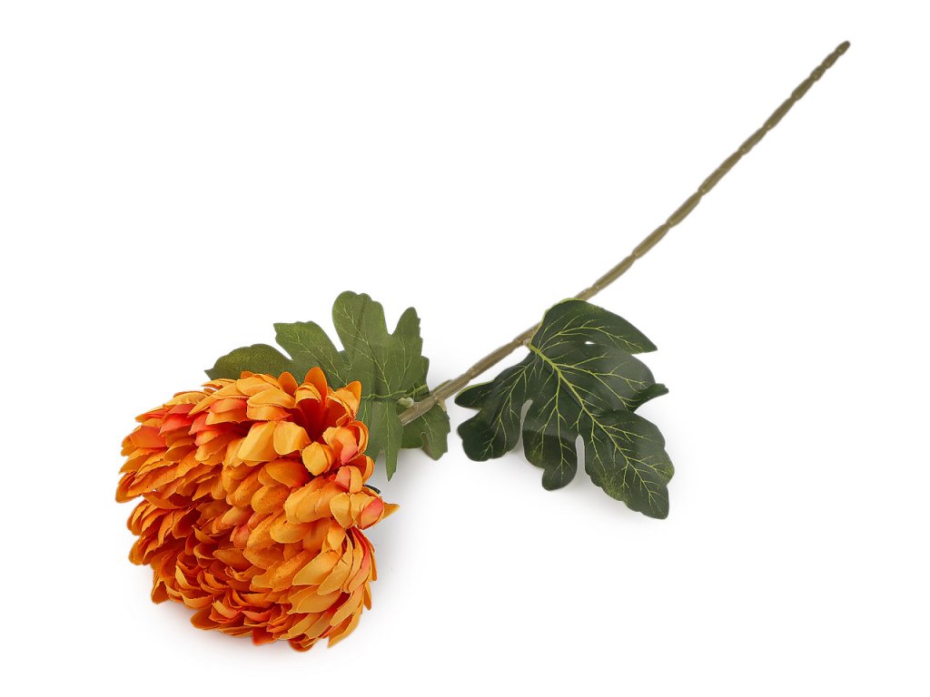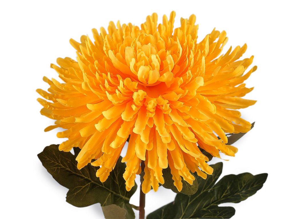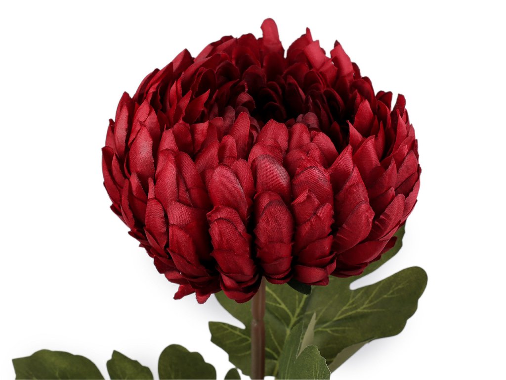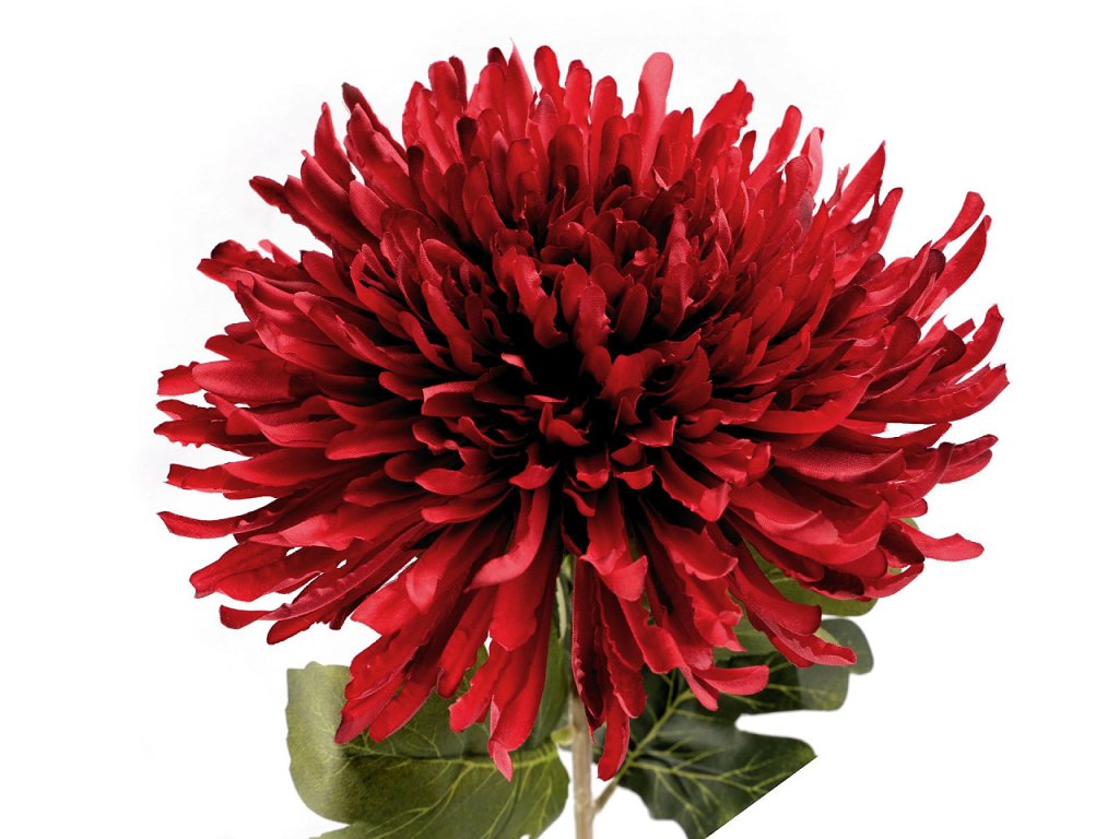 Umělá chryzantéma se pyšní svou velikostí. Květ a listy jsou textilní. Uvnitř stonku je drát. Chryzantémy vyniknou v jednoduché váze, ale také je využijete k aranžování květinových vazeb, věnců i ikeban.- Délka: cca 70 cm