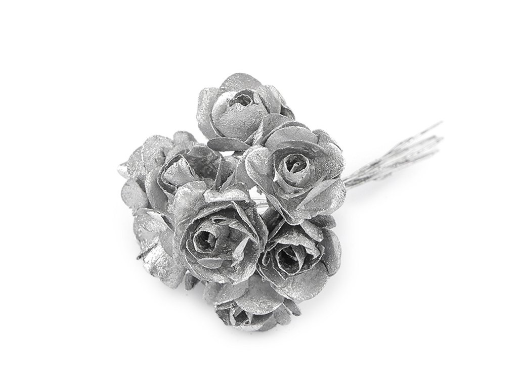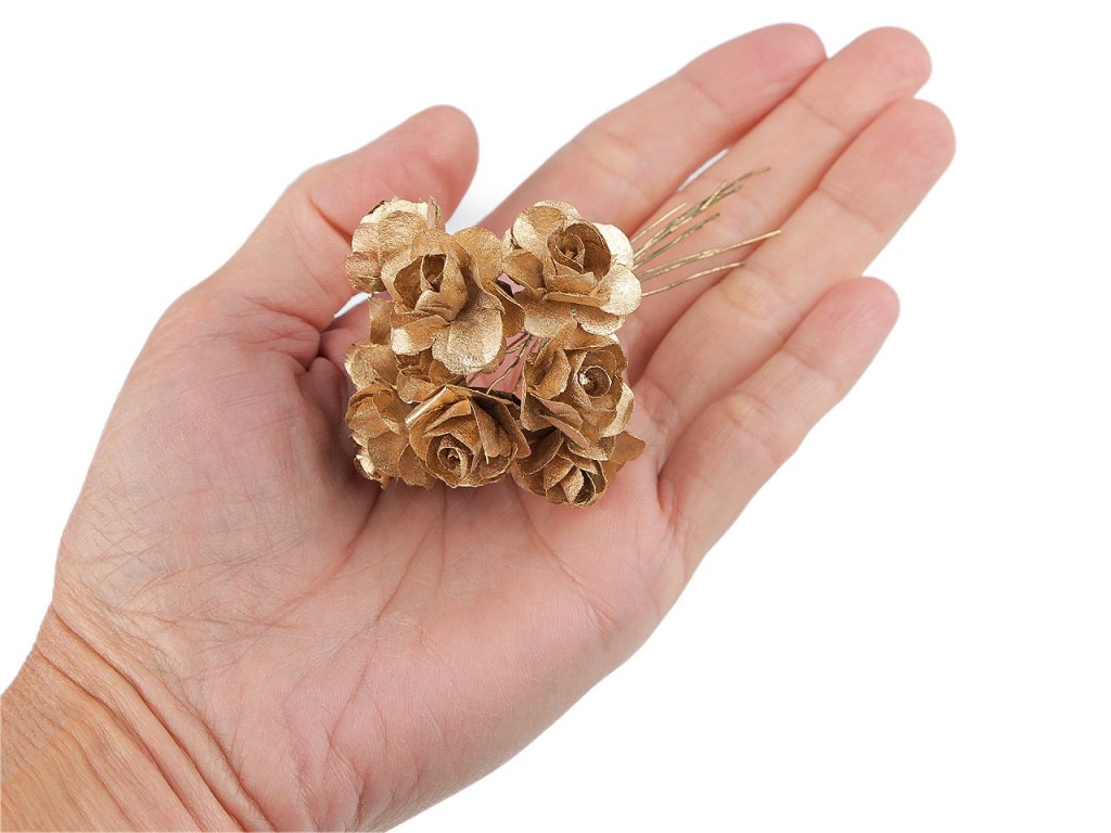 Metalické mini růžičky vyniknou v květinových vazbách, na věncích a v různých aranžmá. Drátek, který je součástí každé růže, usnadňuje jejich připevnění a manipulaci.- Průměr květu: 2 cm