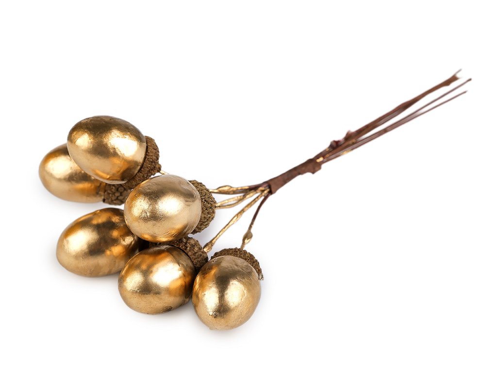Metalické žaludy jsou vyrobené z polystyrenu, kalíšek je přírodní. Díky drátku je manipulace s nimi jednoduchá a umožňuje snadné zakomponování do jakékoliv dekorace. Žaludy vyniknou v podzimních vazbách, věncích, na svícnech apod.- Délka: 14 cm
